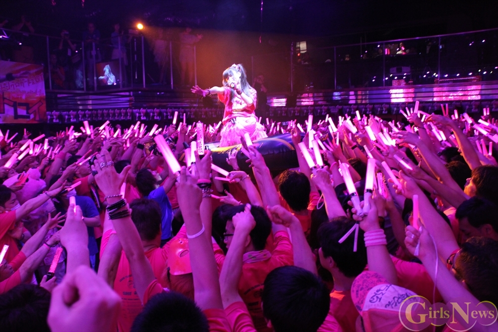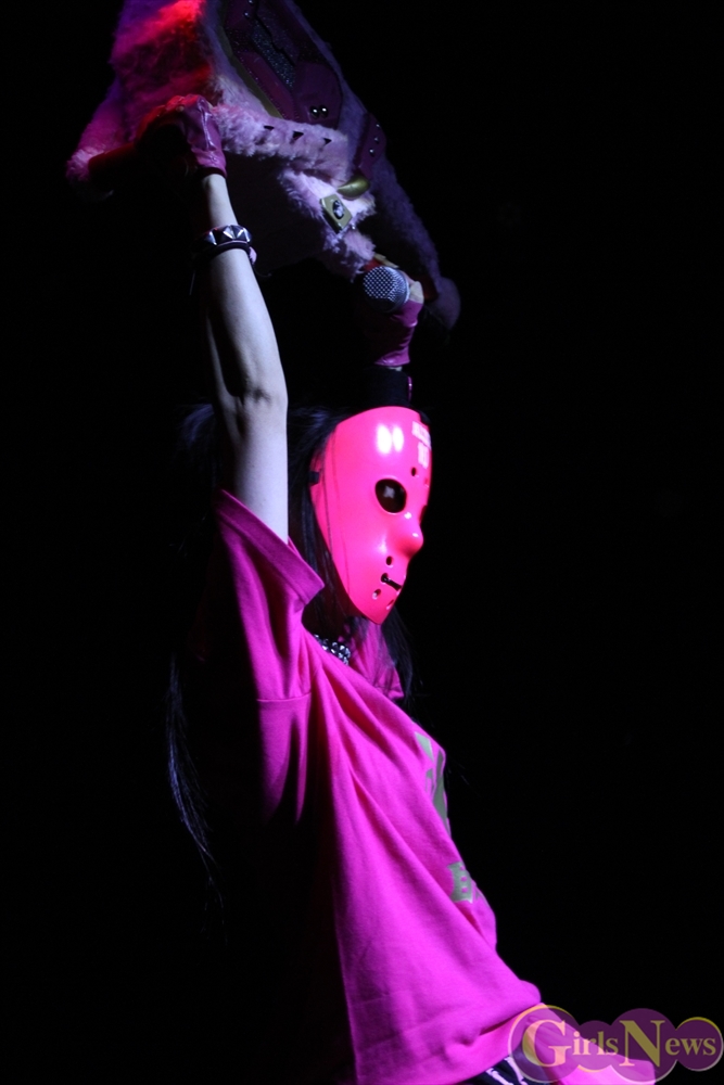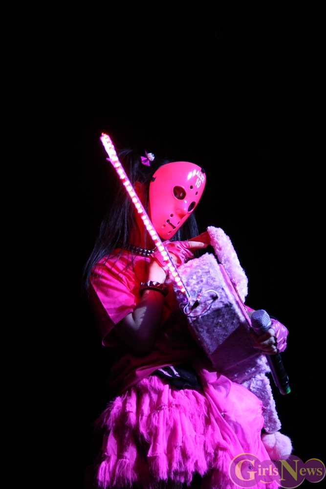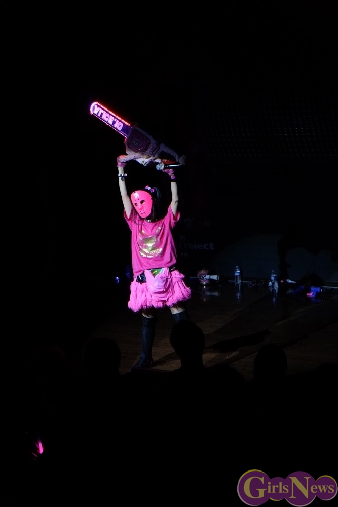 ビデオが終わるとアリス十番SEに合わせて、ジェイソンマスクを装着したアリス十番が登場!集まったファンは皆ピンクのサイリュームを点灯させ、会場は藤崎麻美さんのピンクで埋め尽くされた。