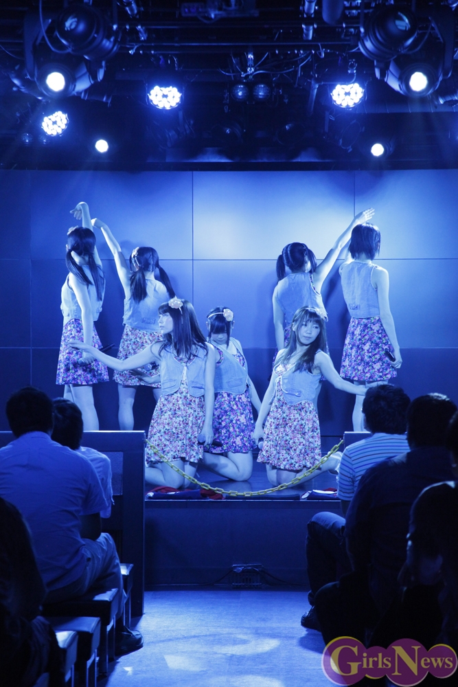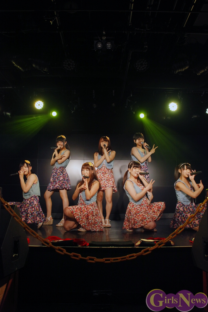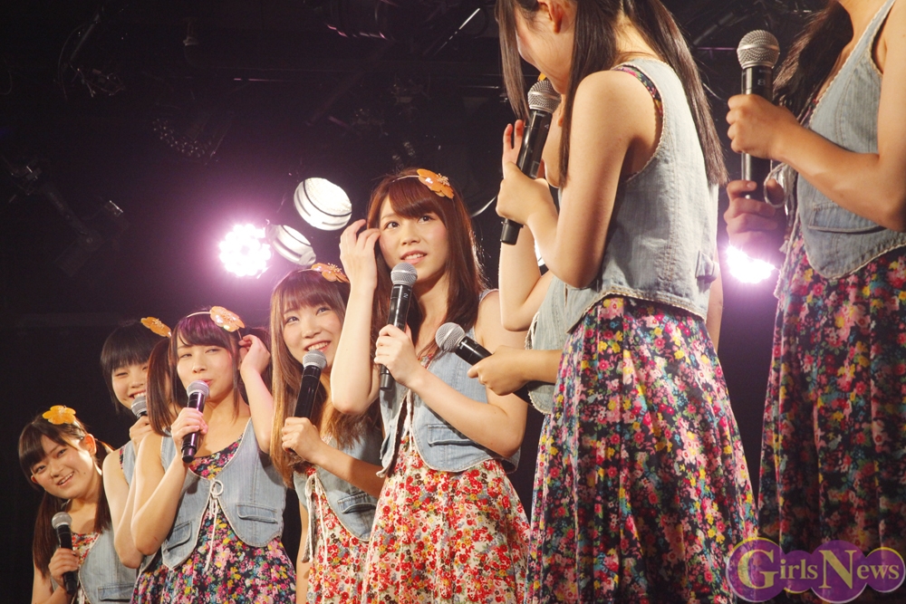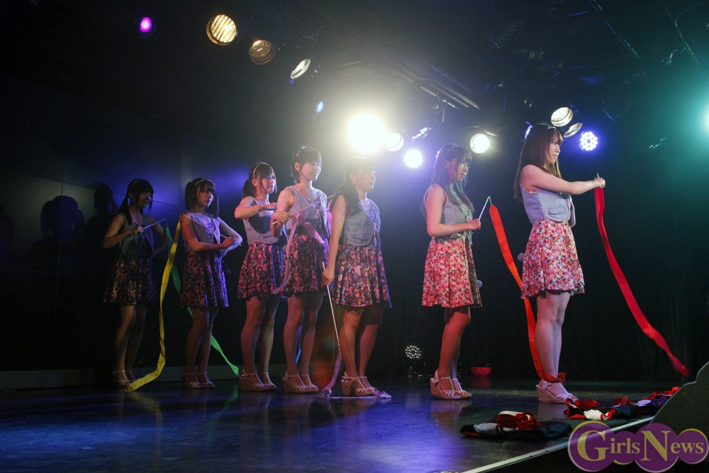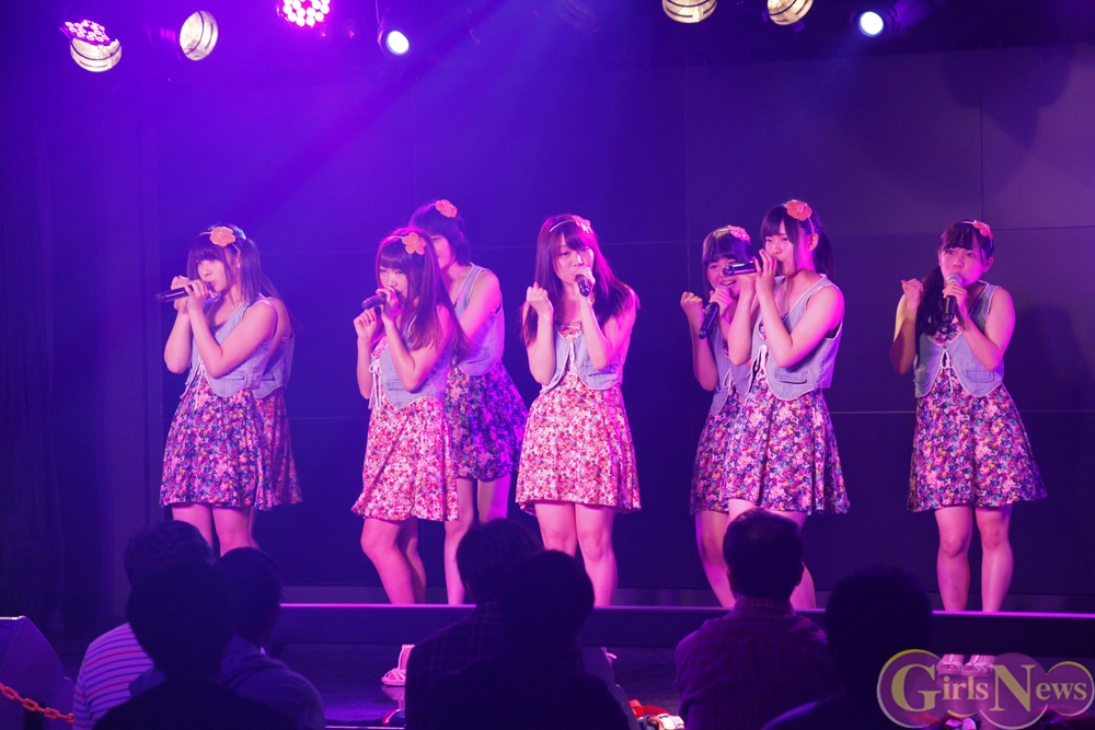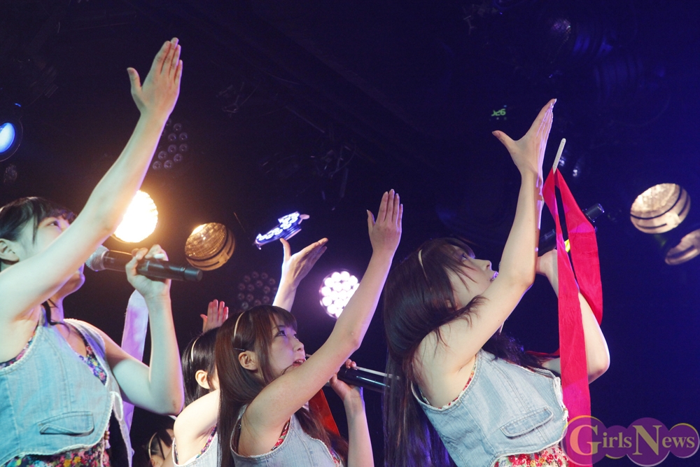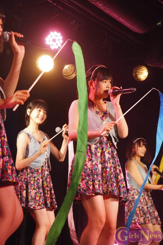 彩り鮮やかなリボンを持ったメンバーが登場し、「七色リアル」でステージの幕が開く。「七色リアル」は聞いているだけで背中を押されるような、JK21随一の応援歌だ。奇しくもライブはサッカーW杯で日本代表がコートジボワール代表に逆転負けを喫した直後。秋葉原にも立ち込めた暗い雰囲気を、メンバーが笑顔と一緒に打ち消した。続いての「年上のダーリン」「エニシングゴーズ」も、アップテンポが耳に残る曲たち。夏の空を思わせるようなパフォーマンスで、老舗としての実力を存分にアピールした。