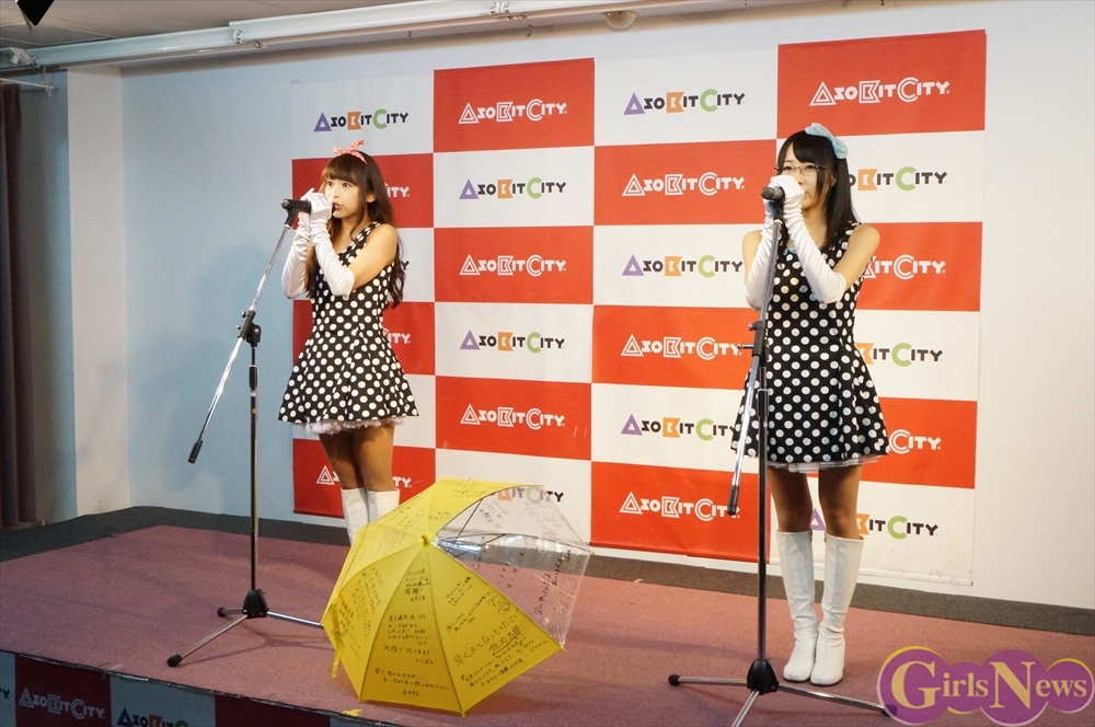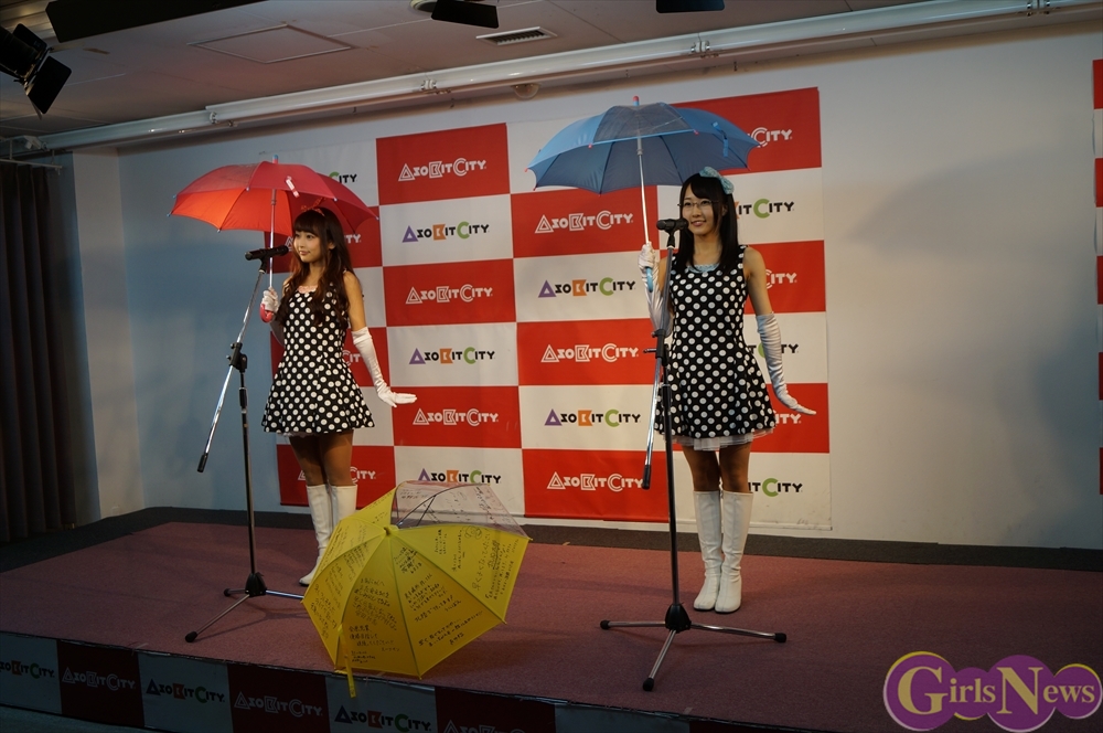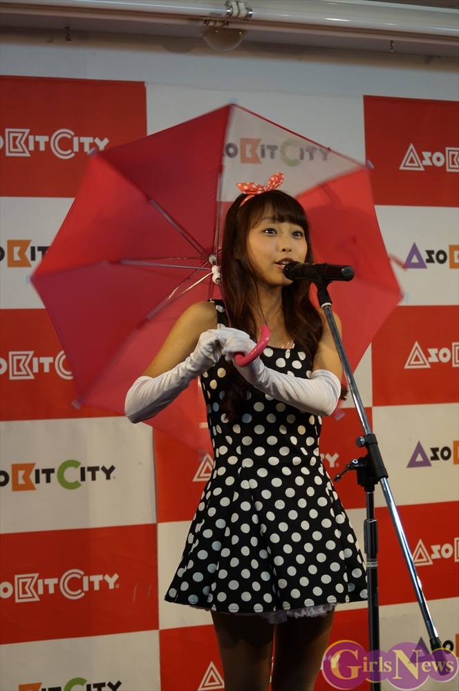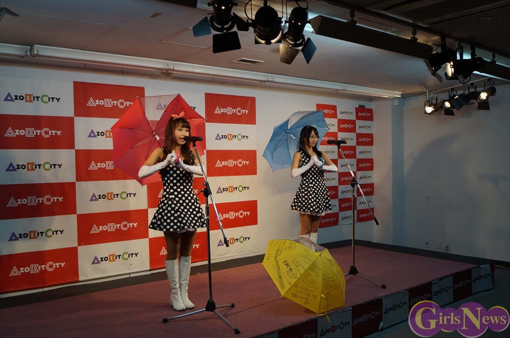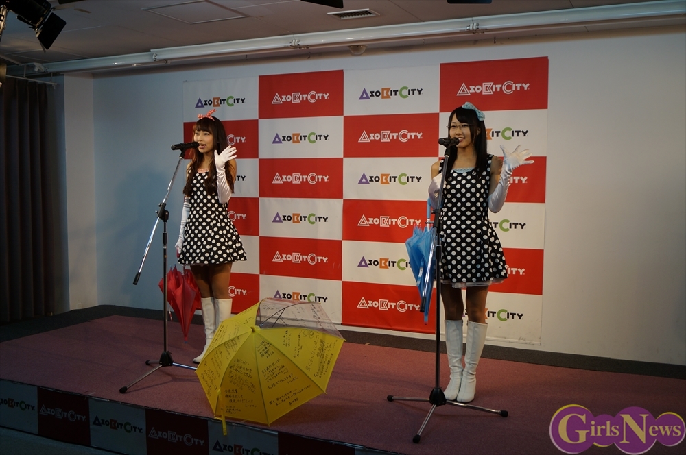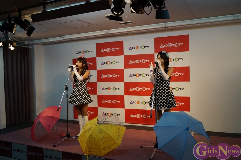 リリースイベント最終日、水玉模様のワンピース姿で登場し、まずは新曲「恋模様」を披露。メンバーカラーの傘を持ってクルクル回したり、歌詞の中にも“アンブレラ”や”天気予報”というフレーズが多く使われており、今の時期にピッタリ。