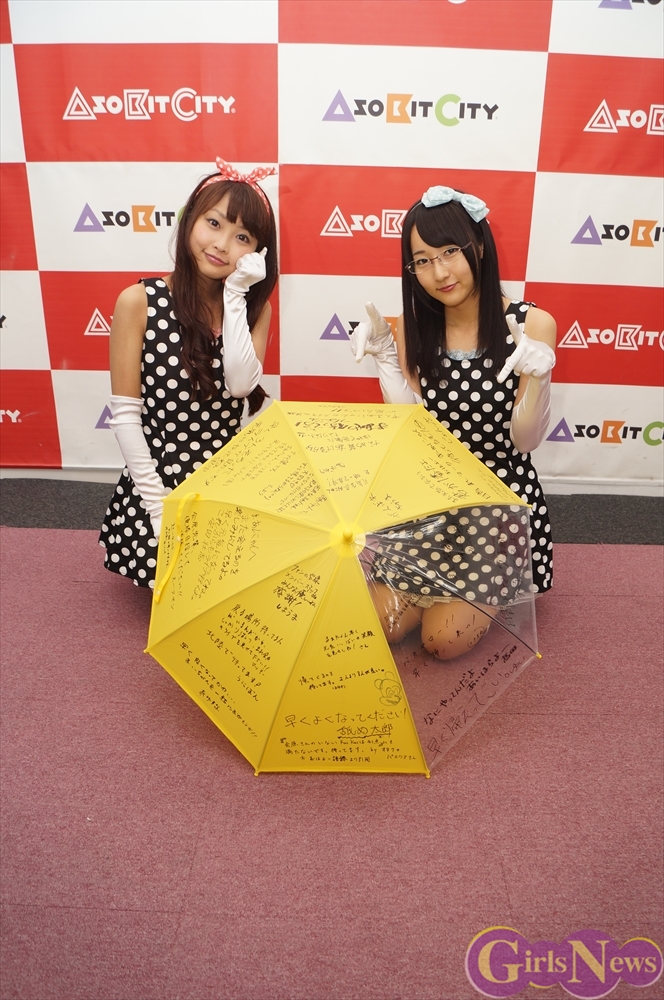 Kus Kusは本来、3人組のガールズユニットだが、会原麻彩さんは現在、病気療養中でお休み中。会原麻彩さんのメンバーカラーでもある黄色の傘にファンからの寄せ書きを集め、ステージ上にその傘を置き、会原麻彩さんが早く回復するよう願っている姿にメンバー間の絆を感じた。