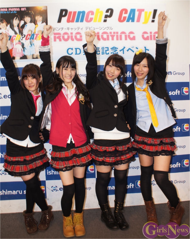 2月19日、アイドルユニット Punch? CATy!(パンチキャッティ)のデビューシングル「Role Playing Girl」(choprica Music)の発売を記念し、秋葉原でイベントを行った。Punch? CATy!は、みおちん(滝川みお)・あすみん(前田明日美)・ゆいぱん(北原唯)・ちーちゃん(千星)の4人組アイドルユニット。秋葉原のアイドルイベントの司会でお馴染みの村山ひとしさんがプロデュースしているユニットだ。