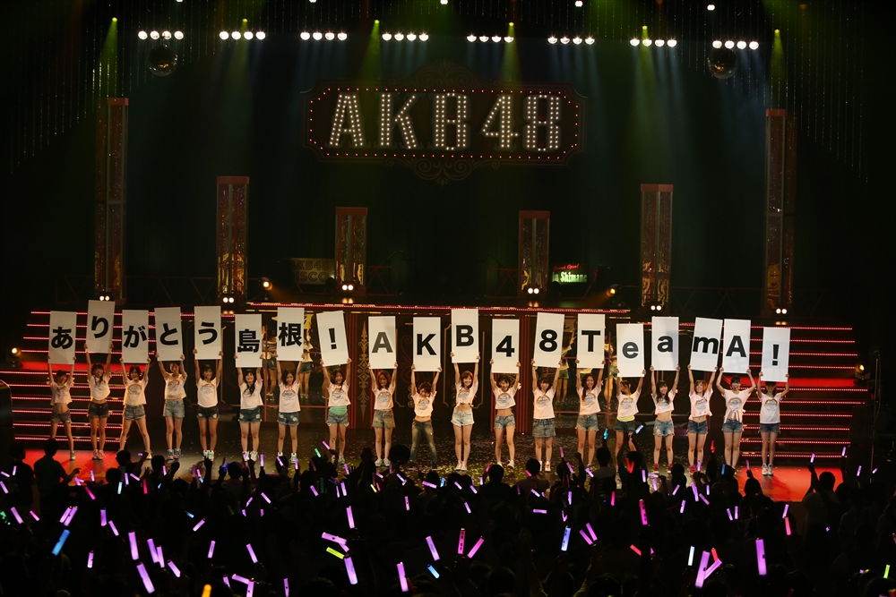パネルを使って島根県のご当地を紹介していく演出に会場も一体となり、最後「ありがとう島根!AKB48 TeamA」というパネルをメンバー全員で掲げると、ひときわ大きな歓声が会場中に響き渡りました。