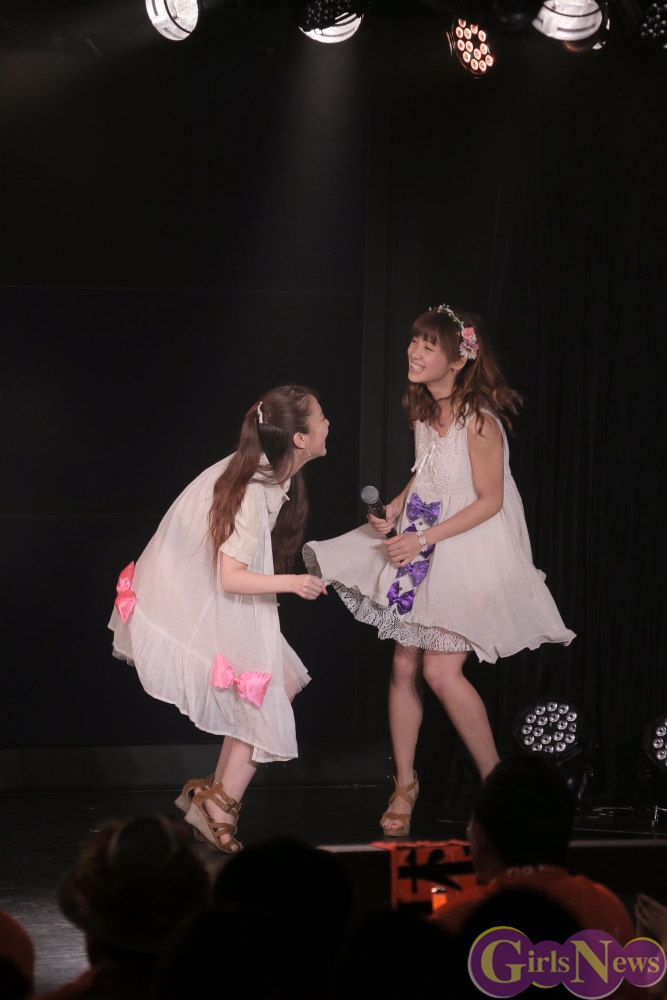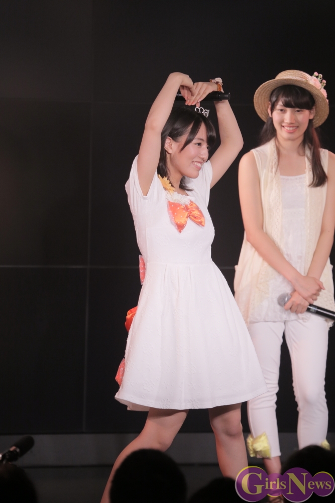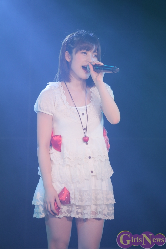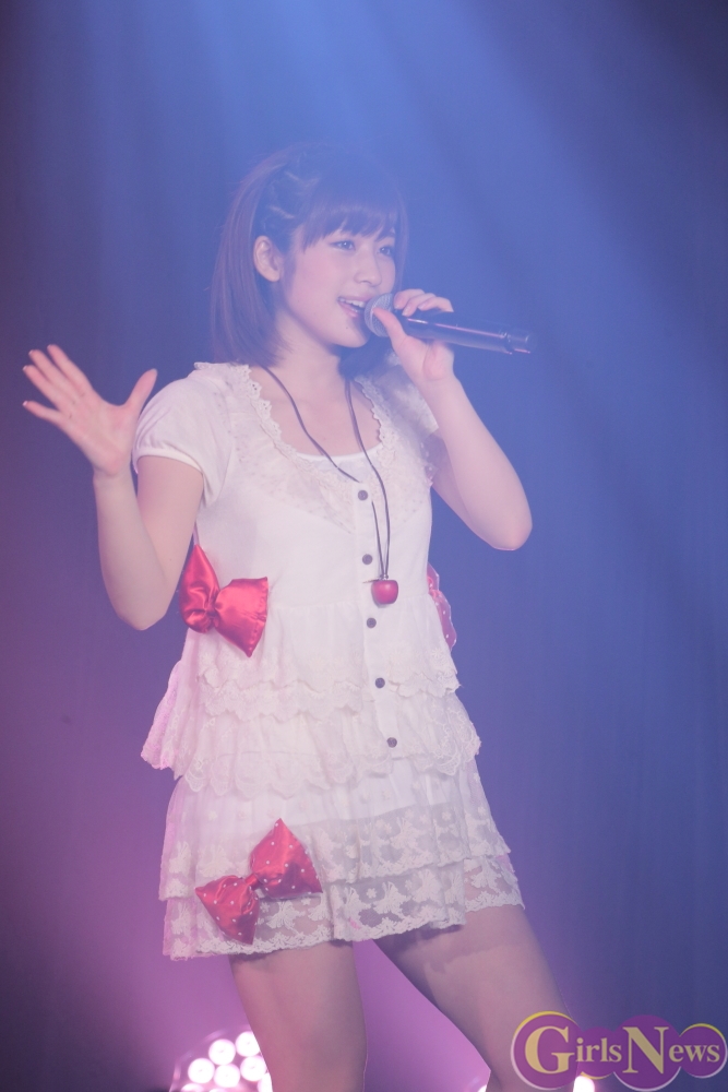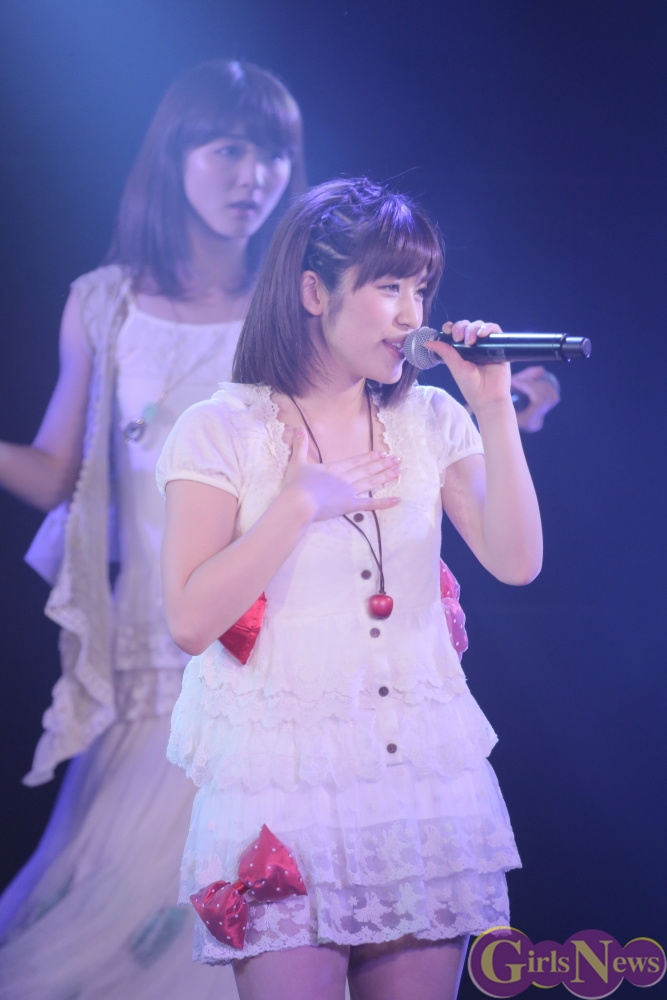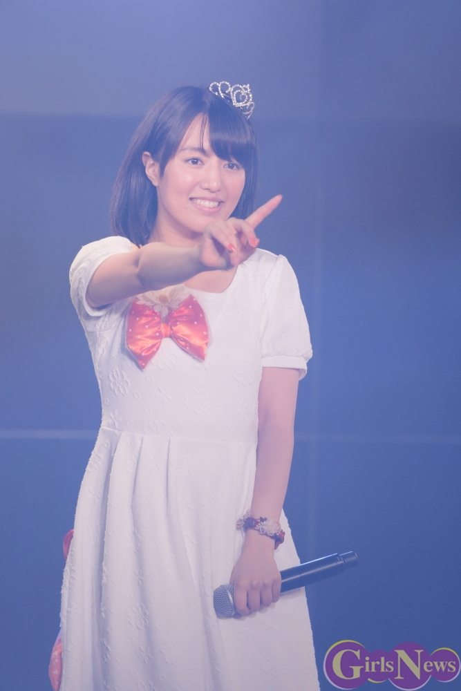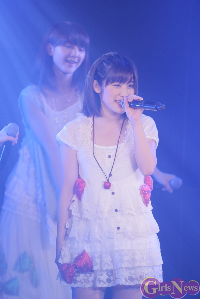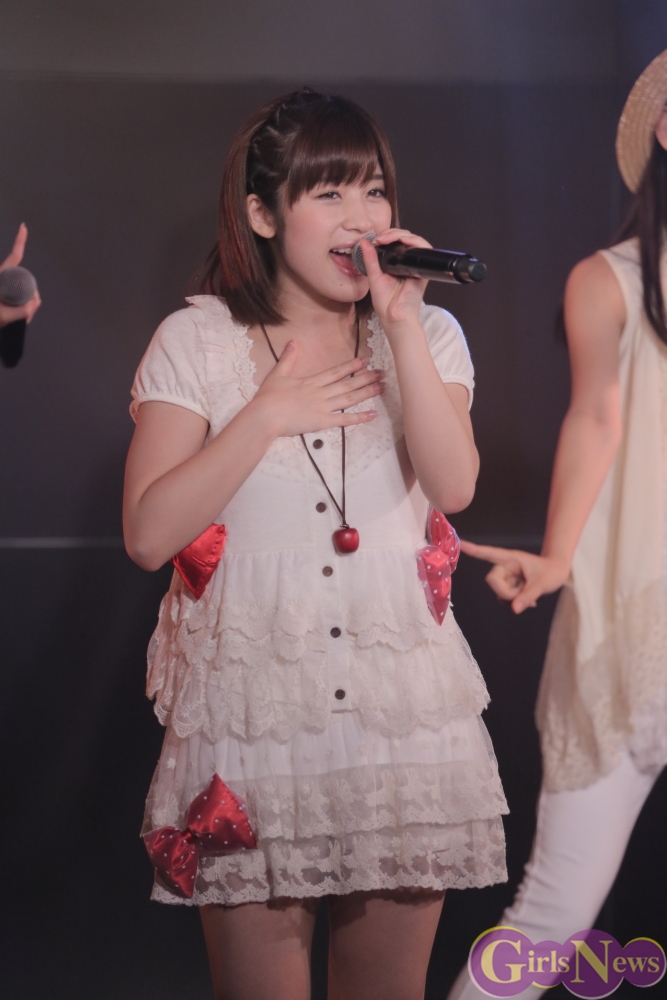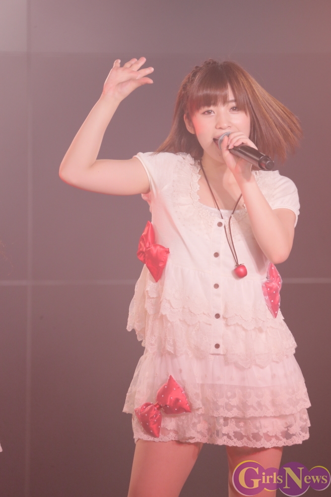 主役の関根さんの衣装は背面にもオレンジのリボンをたっぷりつけたもの。可愛らしくクルっとターンした後、照れ隠しなのか、お得意の「やっぴぃ」ポーズ。MCも「最後までどうかよろしくお願いします。」とやや緊張気味だった。「小悪魔さんから頂いたリンゴ(のアクセサリー)が毒リンゴでないことを祈りながら可愛く頑張ります。」とコメントしたのは仙石みなみさん。普段は侍魂の持ち主を自称する仙石さんも「女戦士の休日」とばかりに短いスカートを揺らしていた。