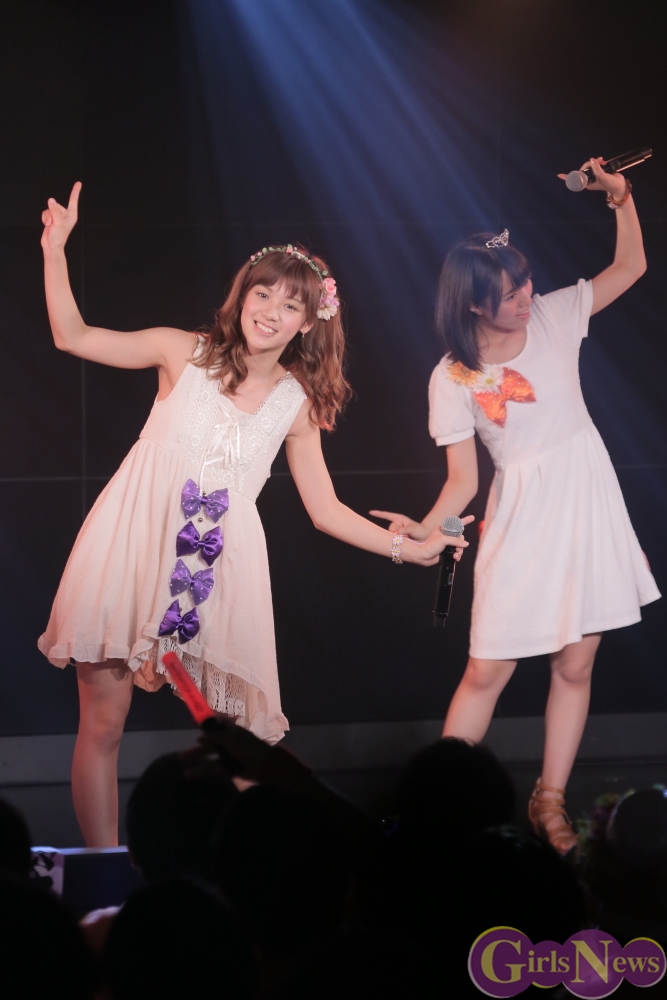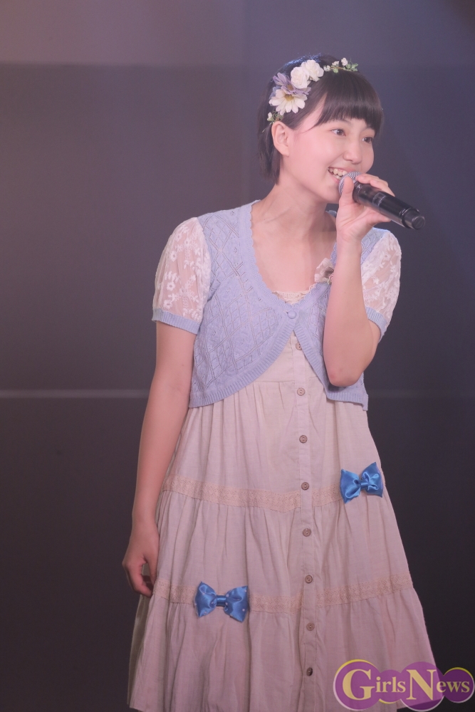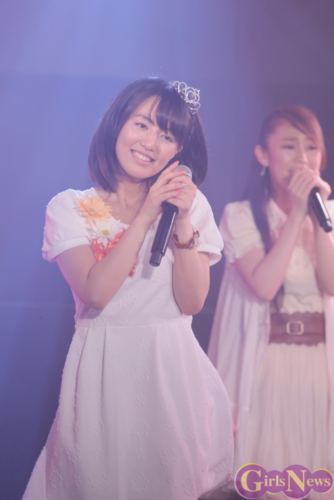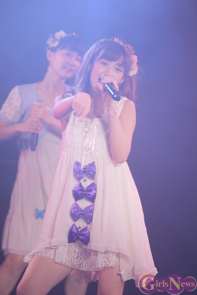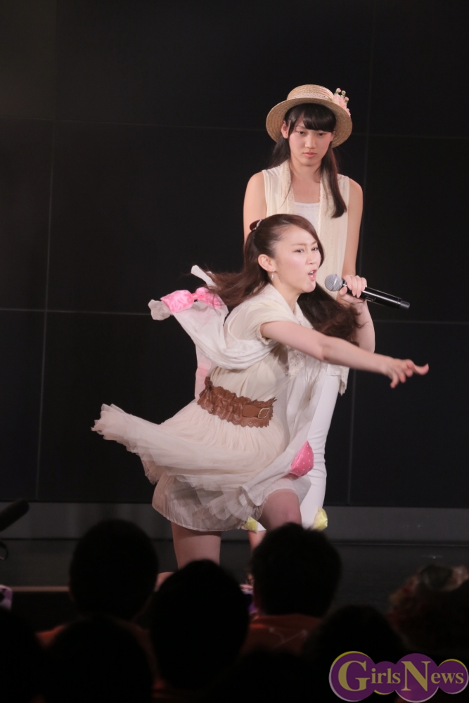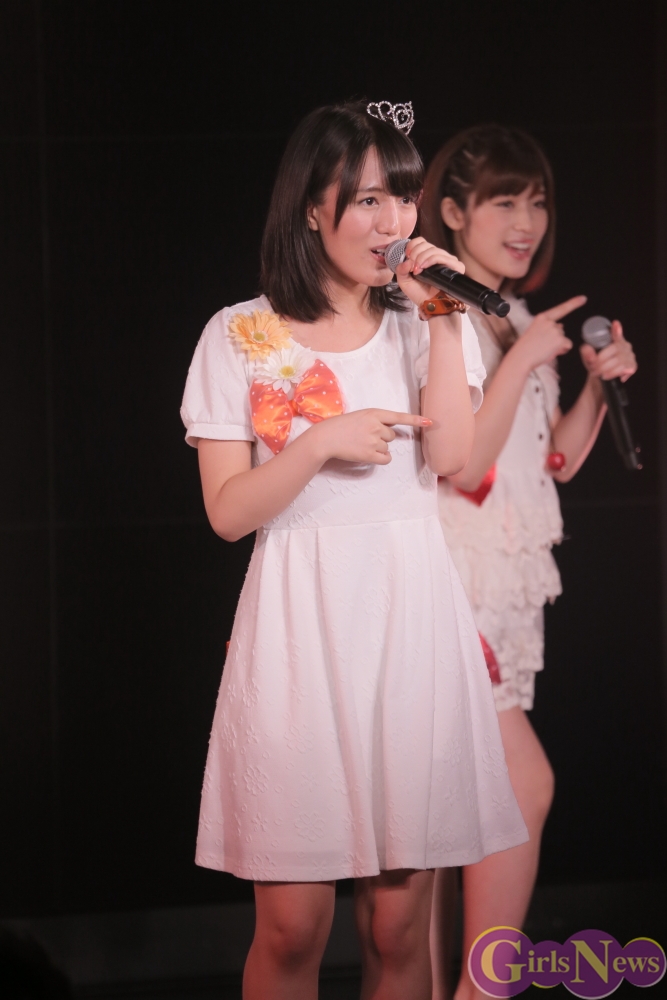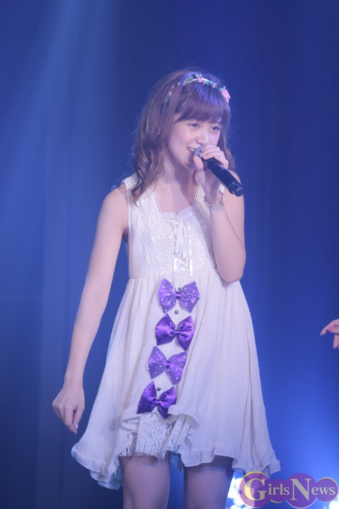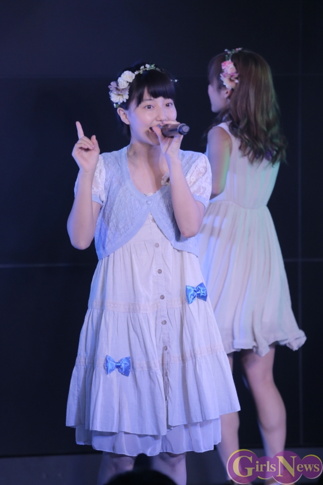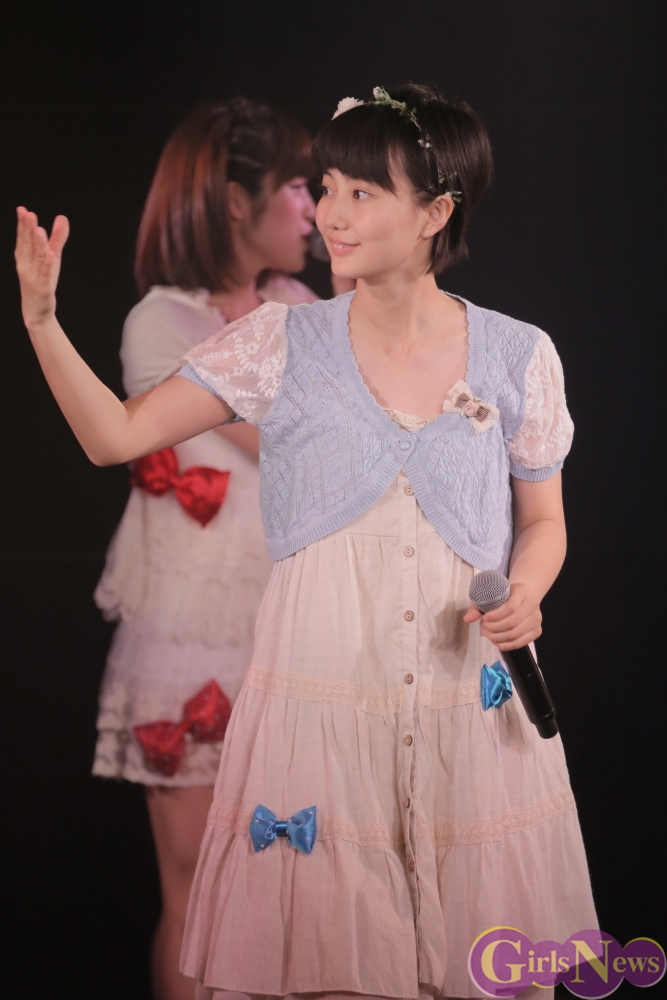 主役の関根さんの衣装は背面にもオレンジのリボンをたっぷりつけたもの。可愛らしくクルっとターンした後、照れ隠しなのか、お得意の「やっぴぃ」ポーズ。MCも「最後までどうかよろしくお願いします。」とやや緊張気味だった。「小悪魔さんから頂いたリンゴ(のアクセサリー)が毒リンゴでないことを祈りながら可愛く頑張ります。」とコメントしたのは仙石みなみさん。普段は侍魂の持ち主を自称する仙石さんも「女戦士の休日」とばかりに短いスカートを揺らしていた。