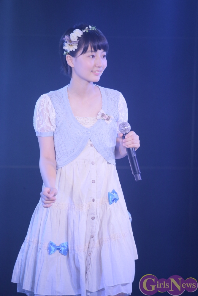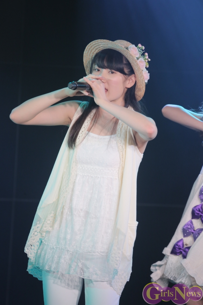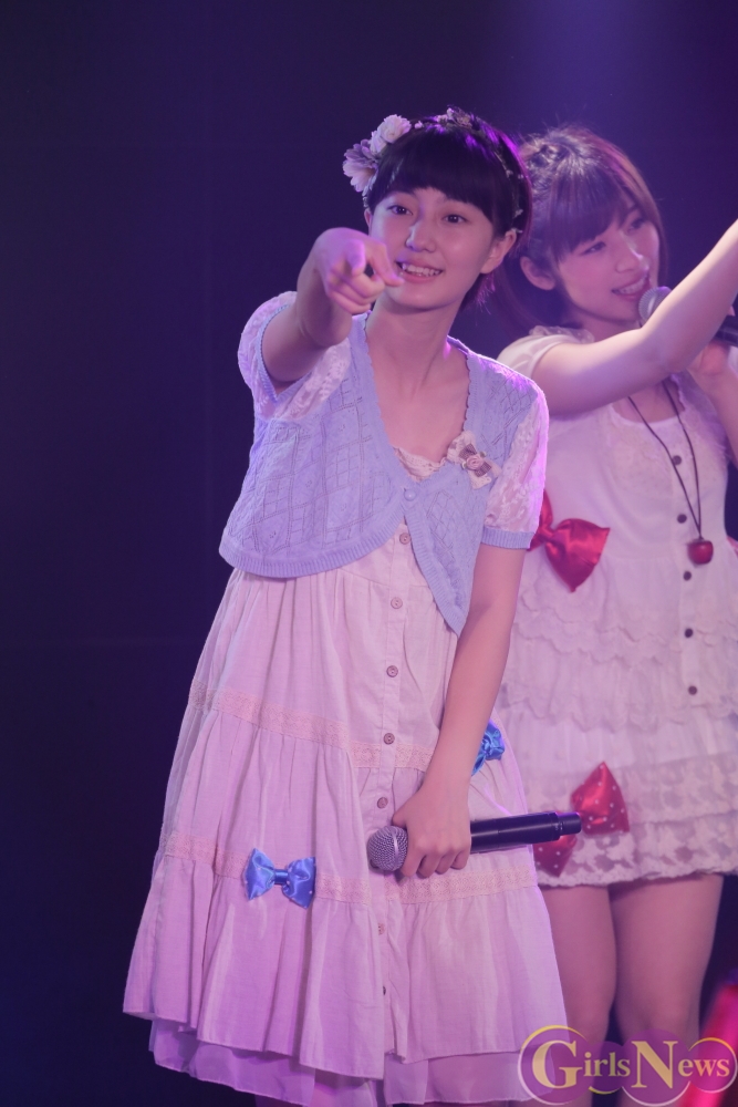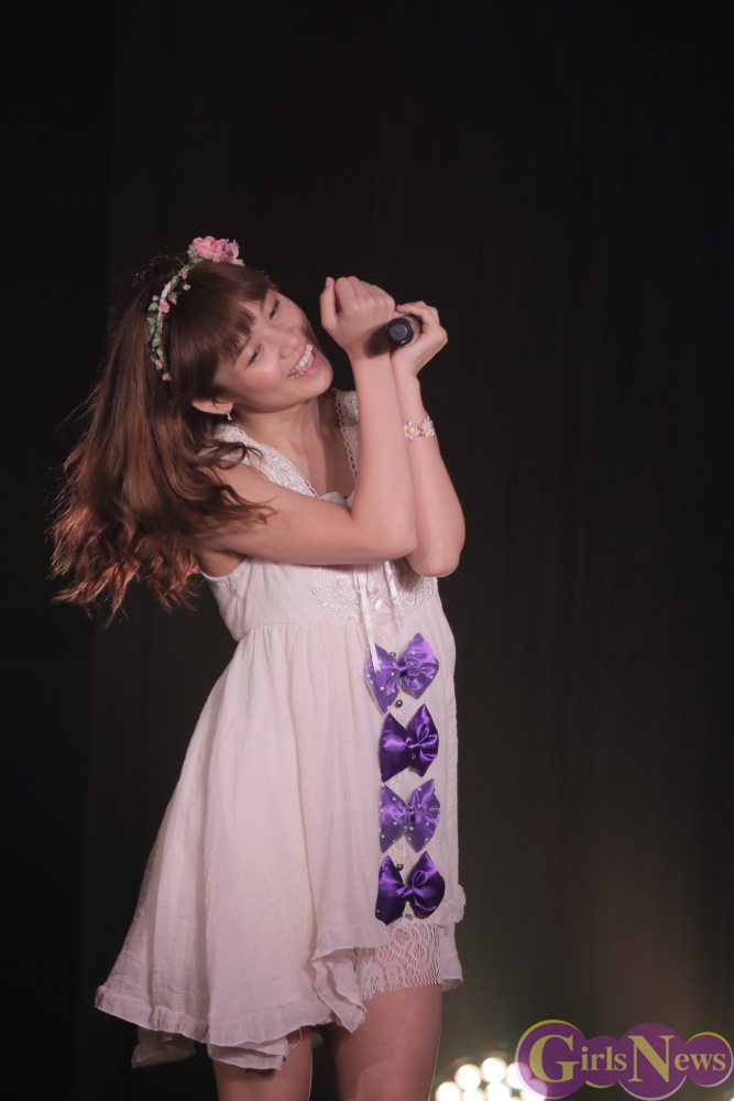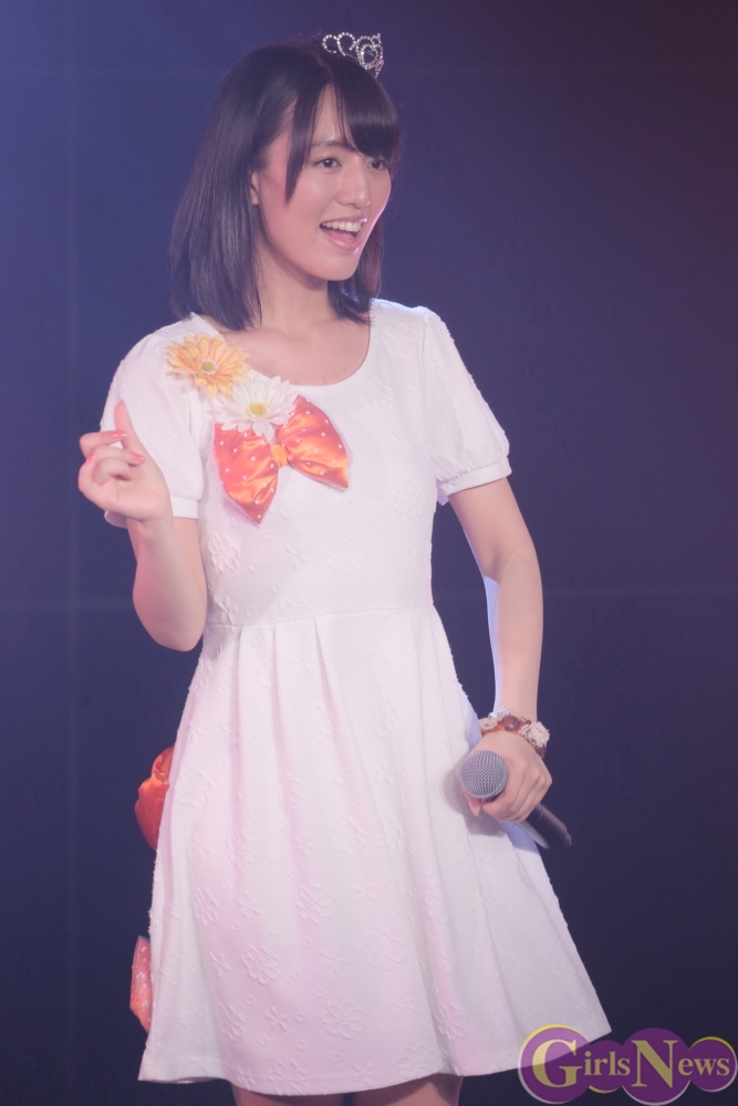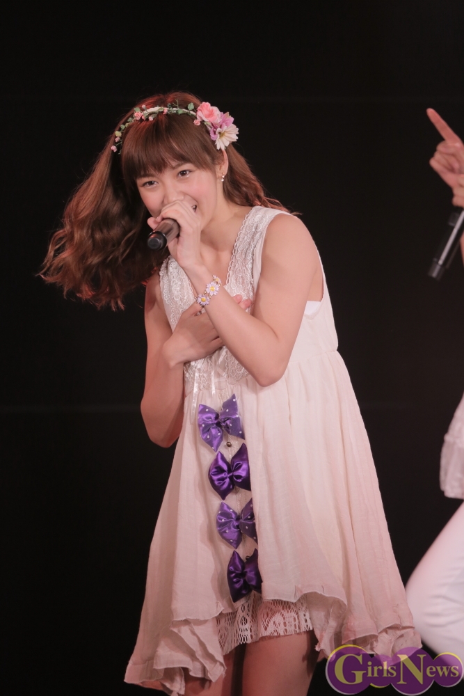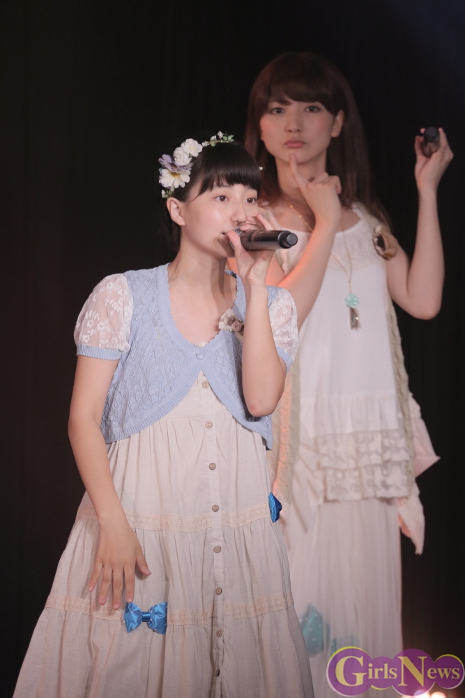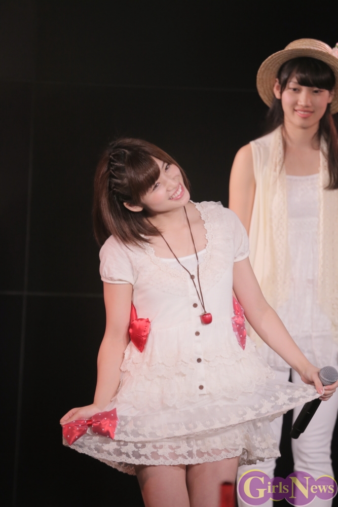 主役の関根さんの衣装は背面にもオレンジのリボンをたっぷりつけたもの。可愛らしくクルっとターンした後、照れ隠しなのか、お得意の「やっぴぃ」ポーズ。MCも「最後までどうかよろしくお願いします。」とやや緊張気味だった。「小悪魔さんから頂いたリンゴ(のアクセサリー)が毒リンゴでないことを祈りながら可愛く頑張ります。」とコメントしたのは仙石みなみさん。普段は侍魂の持ち主を自称する仙石さんも「女戦士の休日」とばかりに短いスカートを揺らしていた。