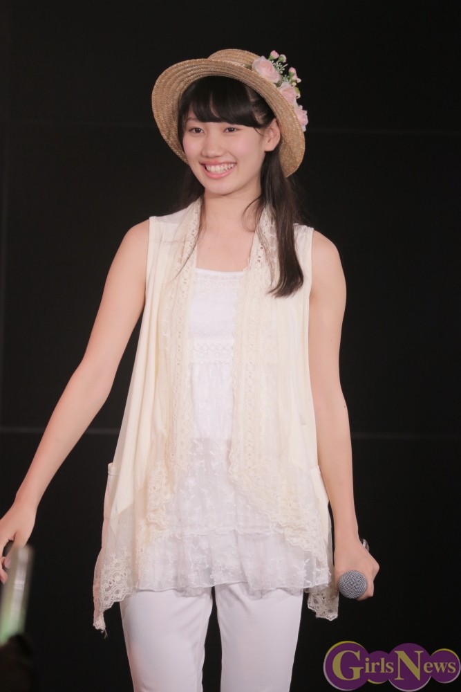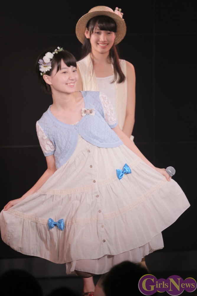 佐保明梨さんには、夏の避暑地を思わせる爽やかなパンツスタイル。手足の長さが際立ち、メンバーの個性に合わせて熟慮した関根さんの努力が垣間みえる選択。「可愛い!」と沸きすぎるほど沸いた会場に向って「今日は可愛らしい破壊王になりたいです。」と宣言していた。