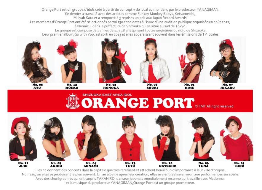 オレンジポートは結成わずか2年足らず、平均年齢14歳、13人編成のアイドルユニット。日本国内は元より、フランスでもほぼ無名の少女たちが、今回ステージゲストとして起用された理由は『ご当地アイドル』としての世界デビュー。過去には、AKB48やももクロ、きゃりーぱみゅぱみゅ等、そうそうたるメンバーがステージを行ったフランスJAPAN EXPOという世界中が注目する大舞台に、13人の無名の少女たちが挑む。