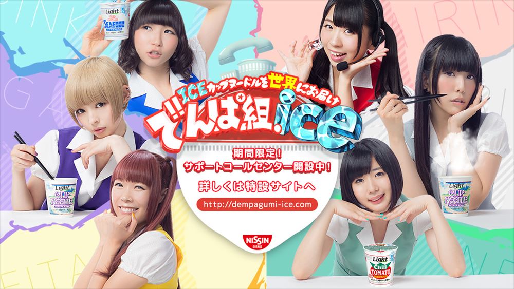 「でんぱ組.ice」は「ICEカップヌードルを世界にお届け!」というスローガンのもと、「カップヌードルライトそうめん」をはじめとする「カップヌードルライト」シリーズに氷を入れて楽しむ「ICEカップヌードル」を広めていくために設立。第1弾の「動画でサポートするICEカップヌードル公式解説動画」に続き、 第2弾は「電話とメールでサポートするサポートコールセンター」を追加し、ICEカップヌードルの作り方・食べ方のサポート体制が更にパワーアップした。