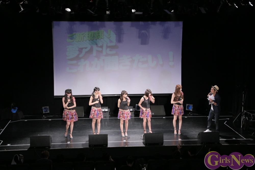 もちろん、アイドルの本分ともいえる曲のパフォーマンスもしっかりと披露。この日は前夜祭公演ということもあり6曲と少なめのセットリストとなったが、夢アドの代表曲「泣き虫スナイパ→」やアップテンポの人気曲「キャンディちゃん」、「17:30のアニメ」などを次々と披露し、会場を沸かせた。また、ライブ中盤では「宇宙初お披露目です」(荻野可鈴)という新曲「絶対的シンパシー」を初披露。アダルトな雰囲気を漂わせたロックチューンで、前述のアップテンポな曲とは一味違う5人の姿を楽しめる一曲だ。もちろん、9月9日発売の新曲「証明ティンエイジャー」も披露し、客席の一角を占めるご新規様にもしっかりと実力をアピールした。