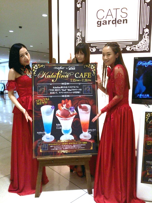 全国キャンペーン行脚初日である7月22日は、名古屋に訪問。タワーレコード名古屋パルコ店には、ベストアルバム展開の他に「moonfesta~ムーンフェスタ~」の衣装展が行われており、実際に足を運んだKalafinaは「懐かしい~」と感慨深く想い出を振り返る場面も。そして、同じパルコ店内にあるカフェ「キャッツガーデン」へ。このお店は、7月31日までの期間限定でKalafina仕様のカフェとなっているとのことで、メニューには「Kalafina Blue」「Kalafina Red」というドリンクや「Kalafina Parfait」というパフェが登場。このパフェの下部分がヒアロ酸ジュレだと聞いたKalafinaは美味しそうに試食していた。そして、店内には大きな垂れ幕がかかり、BGMもKalafina。カフェはまさにKalafina一色となっており、彼女達が今いかに世間で注目を浴びているかが一目瞭然の状況だった。店内の厳かな雰囲気とKalafinaの音楽が鳴り響く空間、そしてKalafinaメニューを食せる今しかないこの空間を是非この機会に体感してみて欲しい!