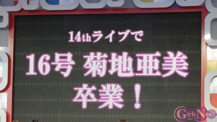 真夏の祭典を飾るフィナーレのステージ。しかし、フジテレビ・森本さやかアナウンサーの突然の登場で、会場の雰囲気は一転する。森本アナの口から告げられたのは、11月24日にNHKホールにてナンバリングライブを行うこと、そしてそのライブでメンバーが卒業することだった。困惑の表情を見せるメンバーとファン。そして、卒業メンバーとして名乗りを上げたのは、バラエティ番組での活躍も著しい菊地亜美さんだった。