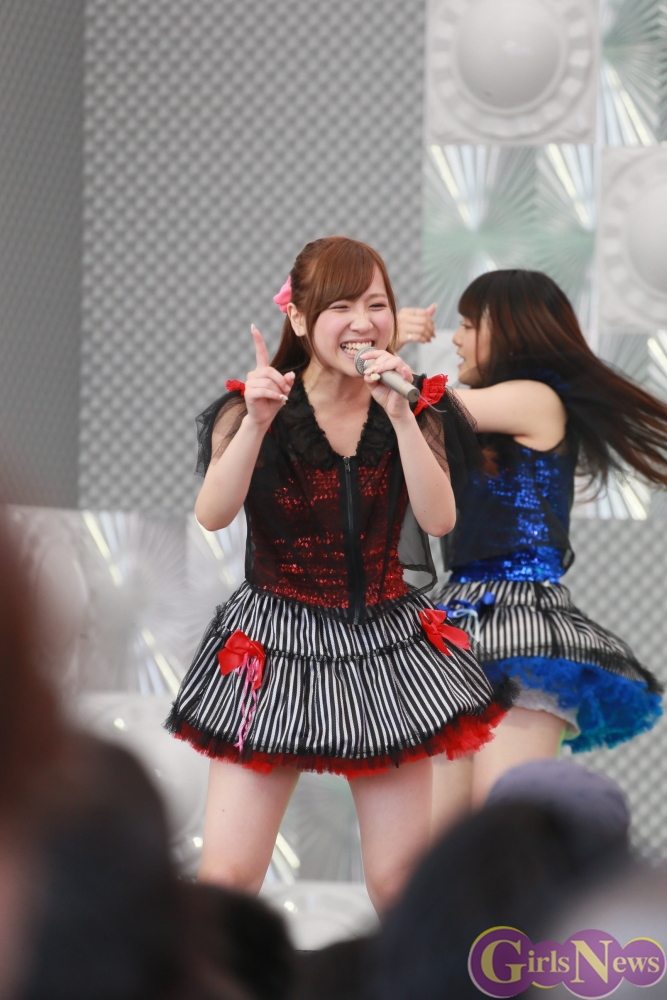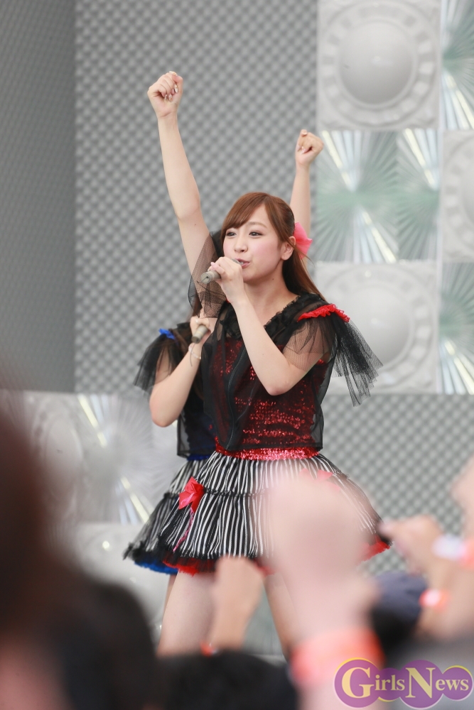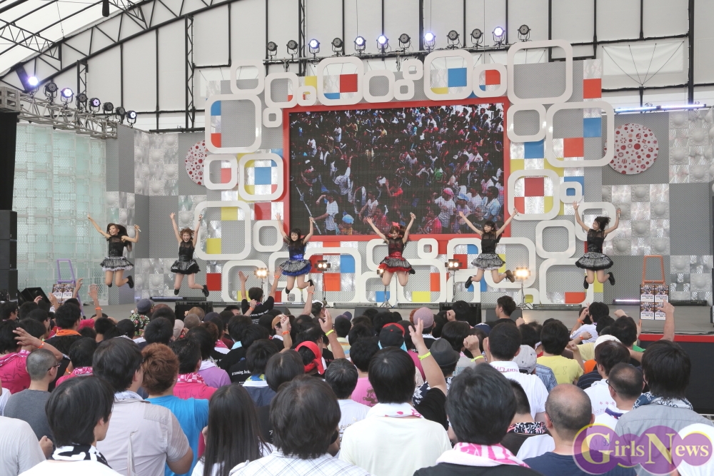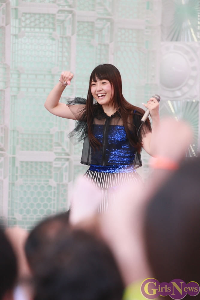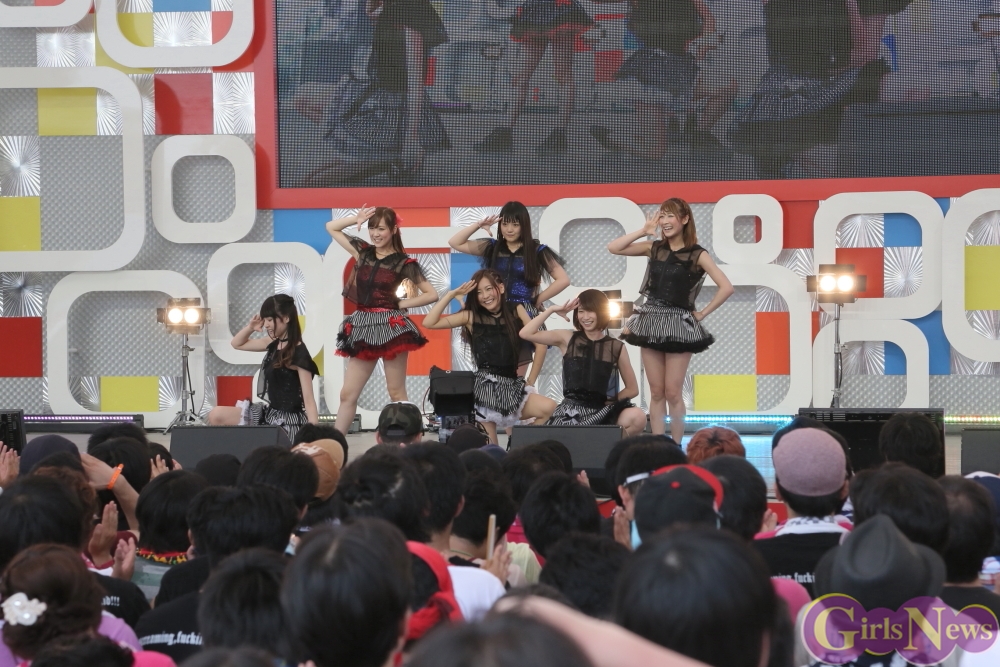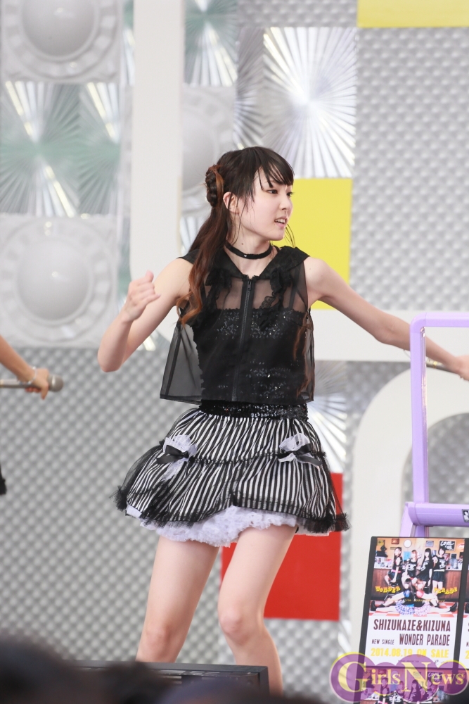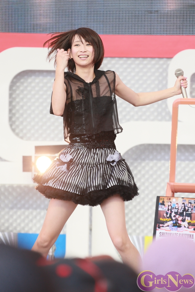 セットリストは全5曲。制約の多いステージということもありファンの上を渡るような暴れっぷりは見ることができなかったが、それでもステージ上に脚立が置かれているグループは彼女たちくらいのもの。メンバーの水野晴子さんが「朝、トップバッターのしず風&絆から、TOKYO IDOL FESTIVAL2日目の一発目から、ホットホットなステージにしていきたいと思うので、ここにいるみなさんでしず風&絆のステージ、楽しんでいってください!」との意気込み通り、まだまだ体が重いファンを煽り臨戦態勢へと導いた。3曲目に披露したのは、8月19日発売の「WONDER PARADE」。ボルテージが上がってきたファンの熱気も助けに、新たな6人の魅力を存分にアピールした。最後の2曲は彼女たちのライブの定番曲ともいえる、「つくしんぼう」と「PINKのロケット」。気が付けば会場に漂っていた朝イチのけだるさは嘘のように消え、TIFのメインステージにふさわしい盛り上がりとなった。