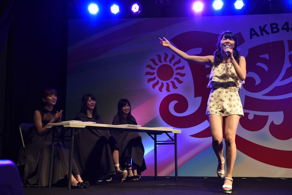 最初のステージは、各雑誌編集部のグラビア担当が審査員を務める「AKB48水着グラビアコンテスト」。朝早い開催にもかかわらず多くのファンが集まり、水着はほぼ初めてという土保瑞希さんをはじめ水着姿のメンバーは恥らいながらもステージを盛り上げた。続いては、HKT48の植木南央さんが「たぶんすべる話」と題したひとりトークショーを展開。オチがイマイチな話も最後は「ありがとうえき」で締めるというマイペース全開なトークで笑いを誘っていた。