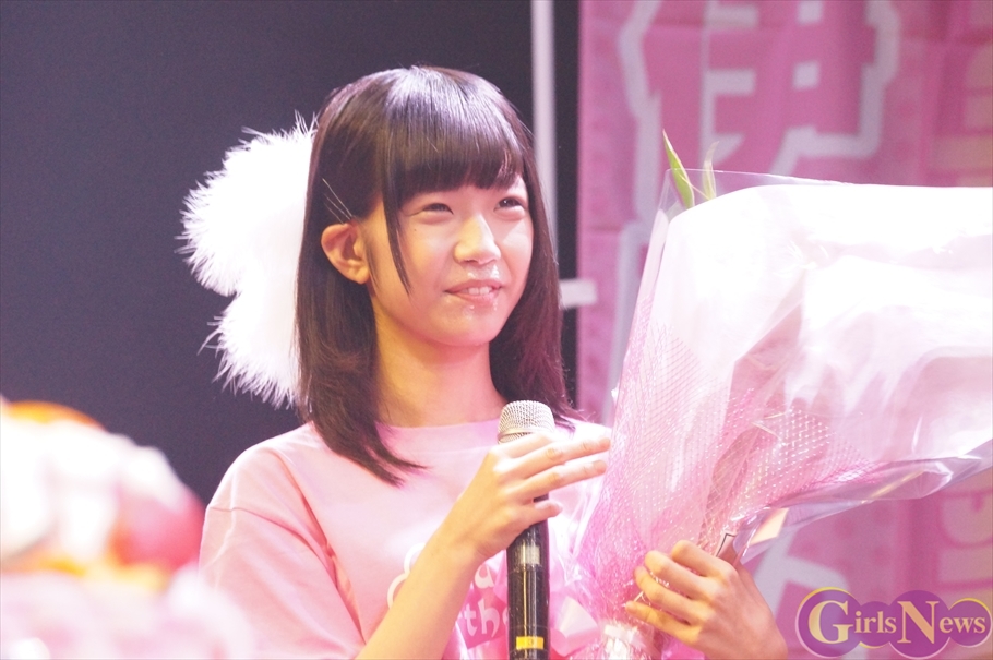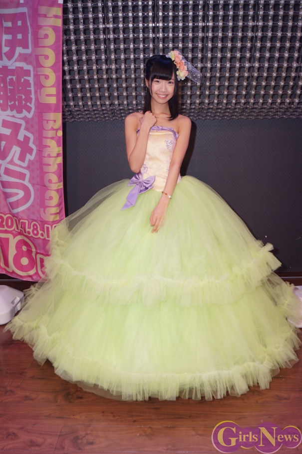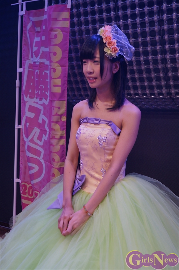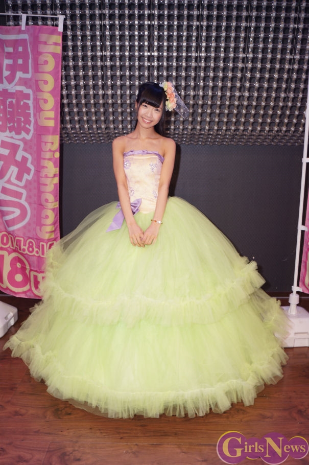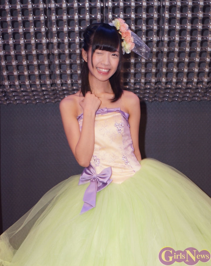 また、ドレス姿を披露したことについて「このドレスは、サイトを見ていて一目惚れしたドレスです。普段、担当カラーのピンクや白の服が多くて、ファンの方にも「何色だと思う?ドレス?」と聞いたときに、やっぱりその2色が多かったので、この期待を絶対に裏切ってやろうと思って、違う色の物を中心に見ていた時に見つけたドレスです。ティンカーベルというかアリエルというか、なんとも言えない不思議な色合いが凄く素敵で、衣装が紫なんですけど、このドレスはラベンダー色のリボンとか小物とかも入っていて、私的にはどストライクです!ファンの方も個性的でかわいいドレスだねって言ってくれて、このドレスで18歳を迎えられて本当に幸せです。」と語り、笑顔を見せていた。
