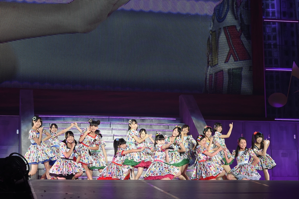 「A!K!B!48!!」の大合唱から「行ってきまーす!」の声と共に会場下手の通路から渡辺麻友を先頭に自転車に乗ったメンバーが『言い訳Maybe』と共に登場。ライブの幕が明け、そのまま起立、礼、着席や、学校の机をストンプ的に使った『Dreamin’ girls』、英語の教科書等、学校をイメージした演出が続く。