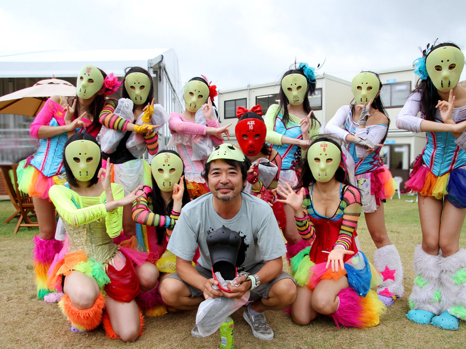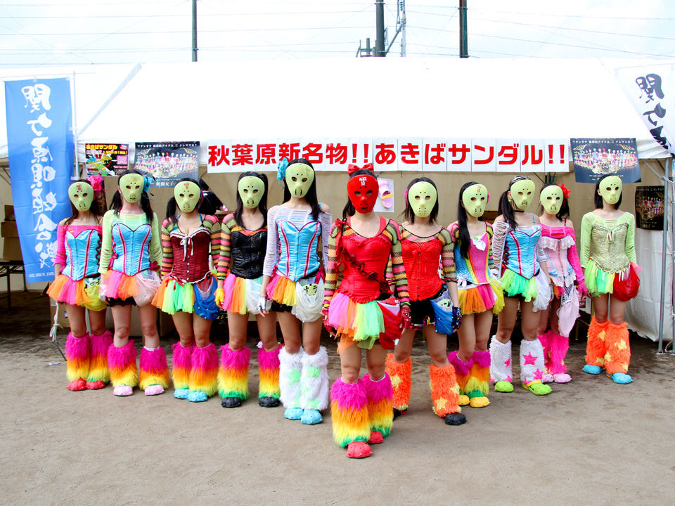 仮面女子が外部でライブを行う時には、会場でこの“あきばサンダル”を有名アーティストに手渡しし喜ばれており、奥田民生さんやスキマスイッチの大橋卓弥さんなどが快く記念撮影に応じる気前の良さを見せている。