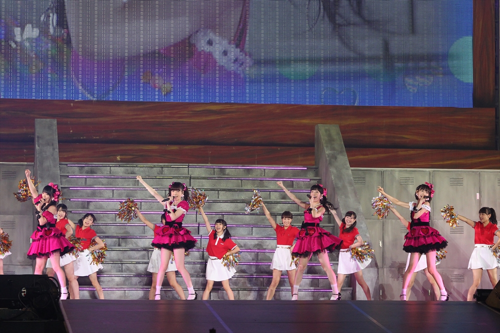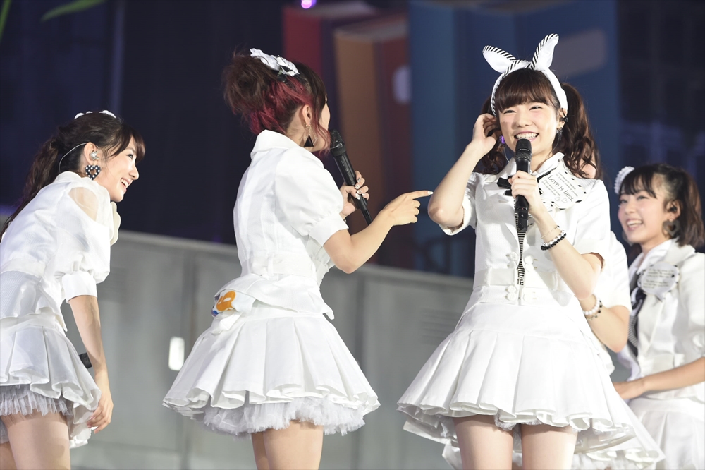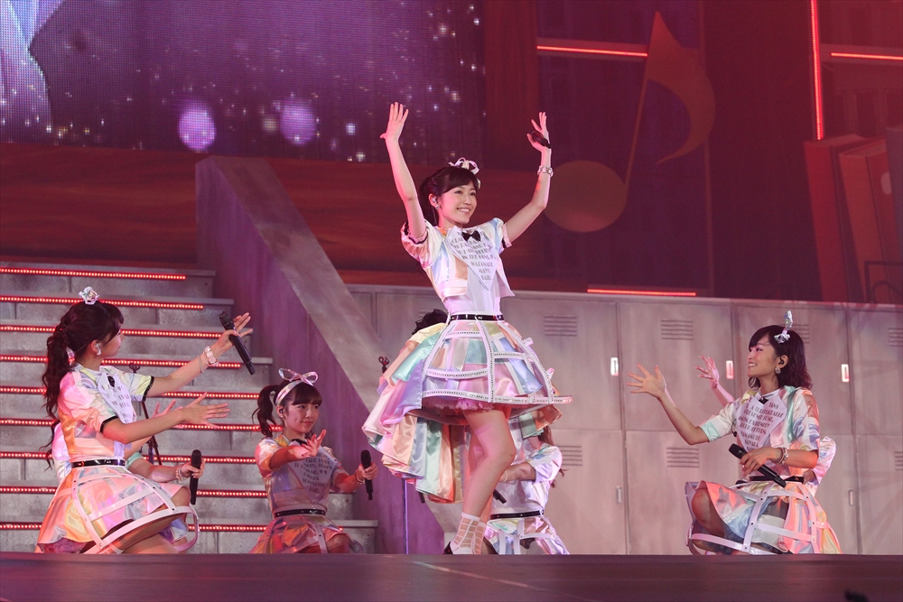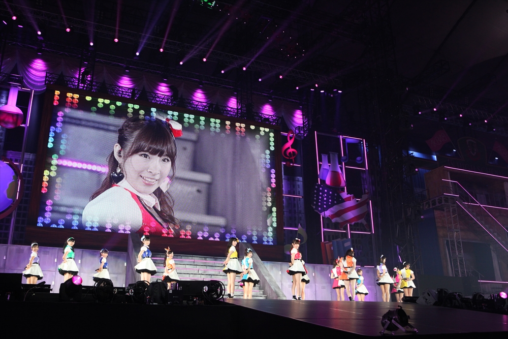 するとそこに「お前らほんっとにスケベだなー!!」の声が響く。不意を突かれつつも「お前もなーー!!」と返す観客。競り上がるセンターステージから小嶋陽菜が姿を現し『ハートエレキ』を熱唱。曲が終わり、入れ替わるようにメインステージから高橋みなみと松井珠理奈が黒と白の衣装で『Bird』をクールにパフォーマンスする。二人への大きなコールが飛び交う中、次に勢いよく現れたのはてんとうむChu!メンバー。『遠距離ポスター』をフレッシュな魅力で歌い、会場を沸かせると、メインステージからは渡辺麻友、島崎遥香、宮脇咲良、川栄李奈が現れ、赤いポロシャツに身を包んだスクールメイツ風の他メンバーが務めるバックダンサーと共に『アイドルなんて呼ばないで』をキュートに披露。