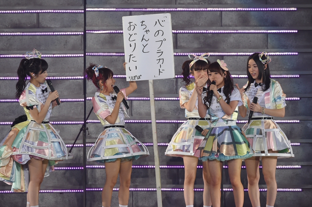 客電が落とされたままの会場。鳴り止まない拍手。やがて起こるアンコールから再び登場したのはネクストガールズ。総選挙33位の藤江れいなをセンターに初披露の『ひと夏の反抗期』をセクシーに歌い上げる。続く『性格が悪い女の子』も初披露はフューチャーガールズ。総選挙49位の岩佐美咲がセンターとなりカラフルな衣装でしっかりと歌い上げる。続けて『心のプラカード』では“東京ドーム3日間本当にアリガトウ”と書かれたプラカードを選抜メンバー達が掲げシンプルに感謝を告げる。