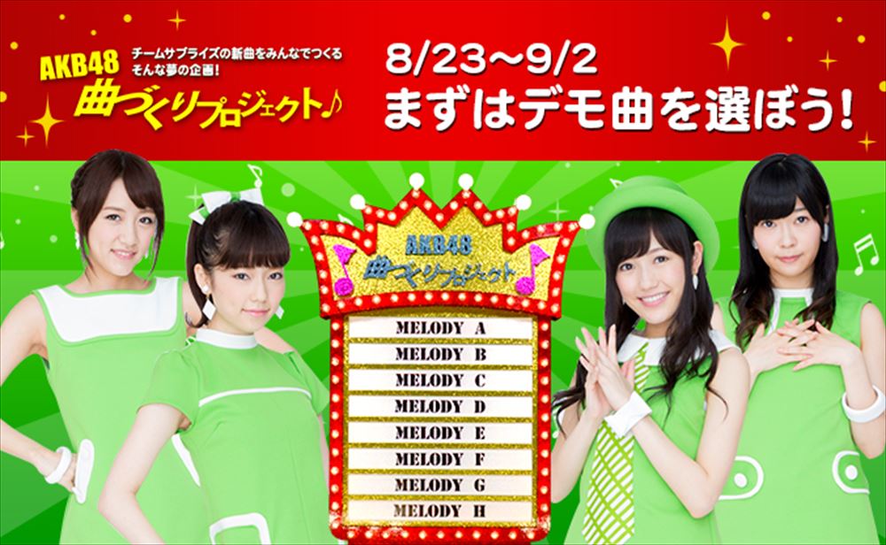 8月23日より、AKB48がファンとともに”チームサプライズ”の楽曲を作る「AKB48曲作りプロジェクト」のデモ曲選択がスタートする。