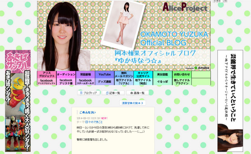 8月23日、アリスプロジェクト常設劇場のP.A.R.M.Sを研究、世に広げることを目的としたユニット、“ぱー研!”のメンバー、岡本柚果さんが「昨日…というか今日の深夜2時から朝8時にかけて、洗濯して外に干していた衣装一式が起きたらなくなっていました……(;_;)」と自身のステージ衣装が盗難にあってしまったことをブログとTwitterで報告した。