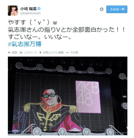 9月15日、AKB48 チームAの小嶋陽菜さんが「やすす(^ν^)w 氣志團さんの煽りVとか全部面白かった!!すごいなー。いいなー。」と自身が出演した氣志團万博の感想をTwitterで報告した。