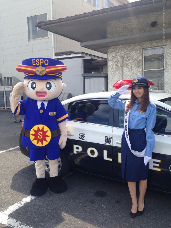 昨日の川崎フロンターレVSFC東京の多摩川クラシコを取材後、早朝に東近江市に入り、任命式を受けた橘署長は交通安全運動に向かう白バイやパトカーの出発式を行ない、自身もパトカーに乗ってショッピングセンターへ向かいESPOくんと啓蒙活動を行った。