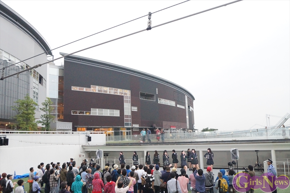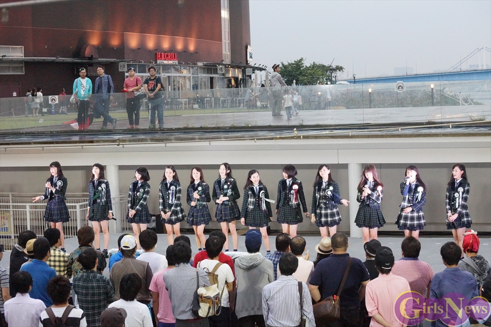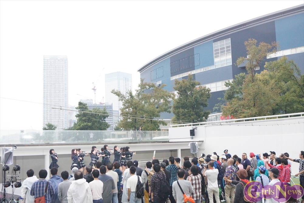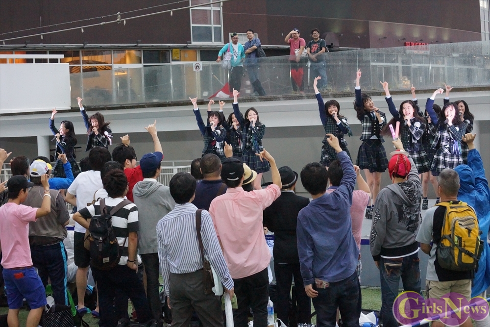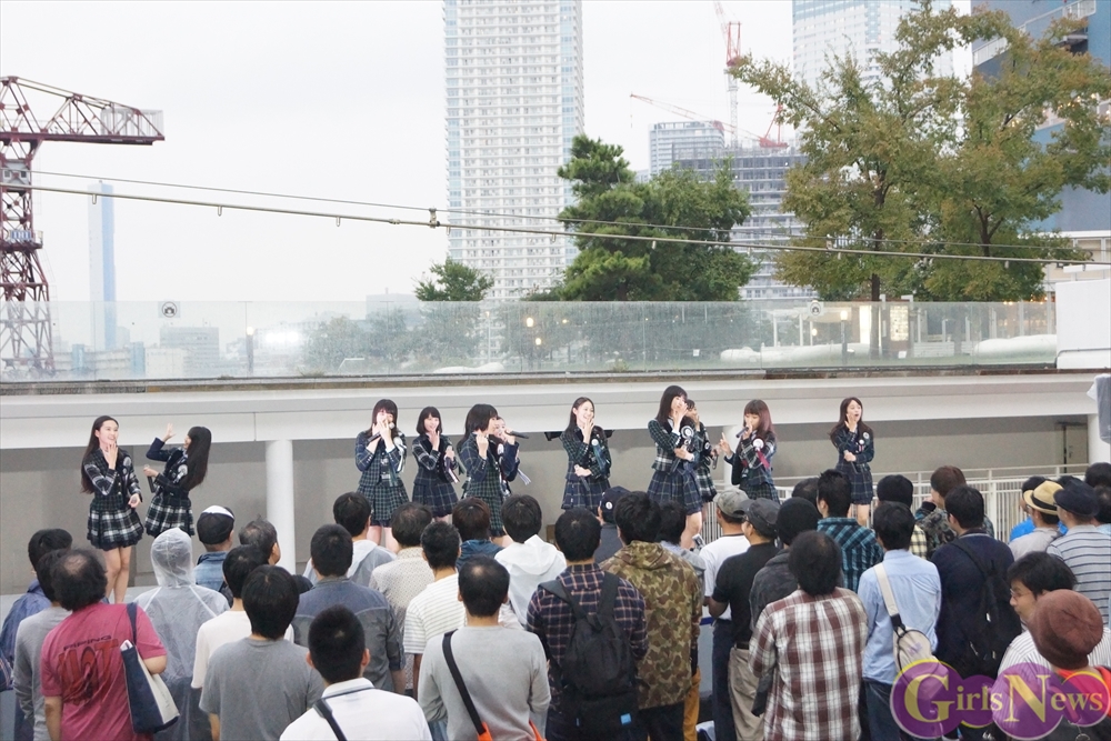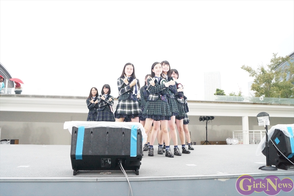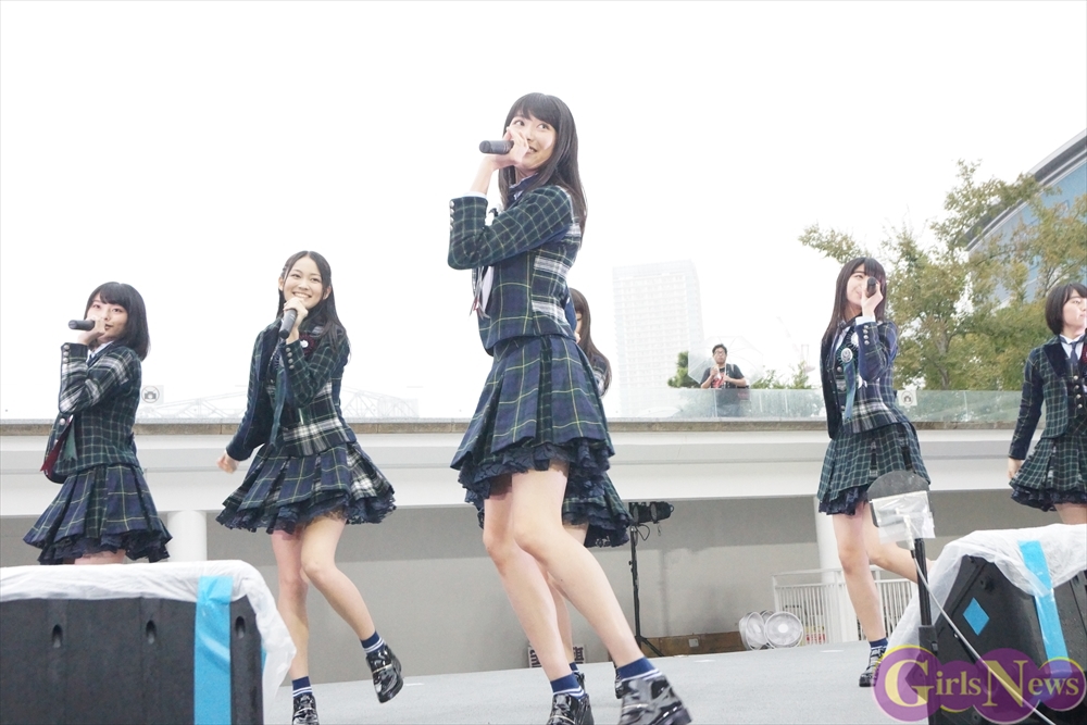 「GO!GO!X21~ドキドキ初登校~」を元気いっぱいに披露すると、再び雨が降り始めるも、イベントは続行。吉本実憂さんは「今日、9月24日は私たちの3rdシングル“ハッピーアプリ”のリリース日です!」と挨拶。メンバーの自己紹介を行い、続いて「恋する夏!」を披露!