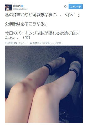 10月10日、NMB48兼AKB48の山本彩さんが「私の膝まわりが可哀想な事に、、ヽ(´o`; 公演後は必ずこうなる。 今日のバイキングは膝が隠れる衣装が良いなぁ、、(笑)」とTwitterを更新した。