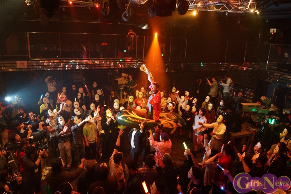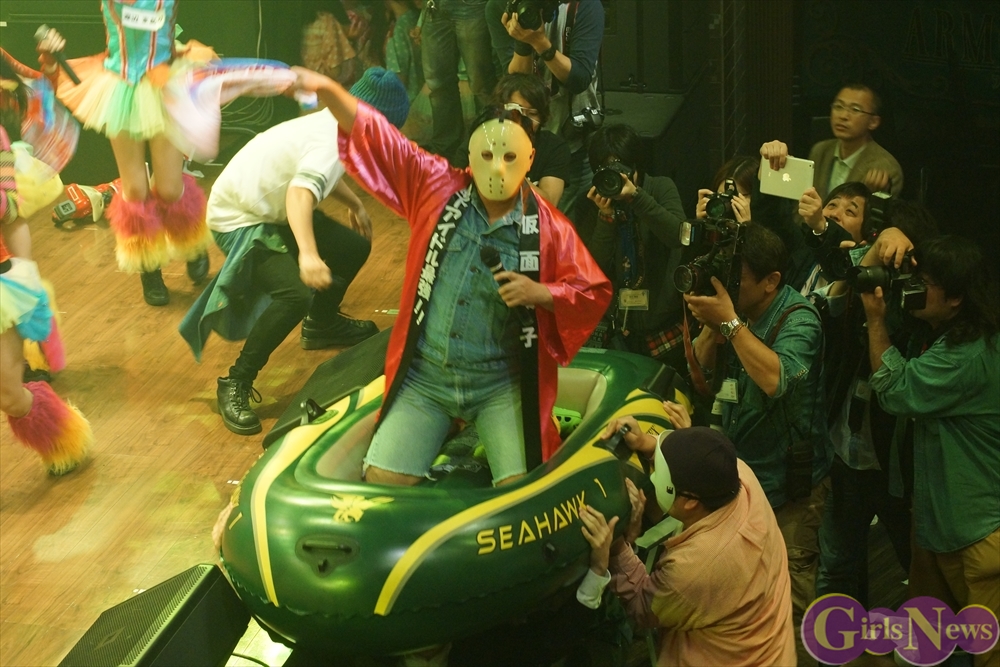 この日は、先日のZeppTokyoで初披露した「マリン☆ロード」など4曲を披露。スギちゃんも関係者席で仮面女子のライブを応援すると、「夏だね☆」の曲では仮面女子に誘導され、ボートに乗ってサビの部分を歌い、ファンと大合唱。