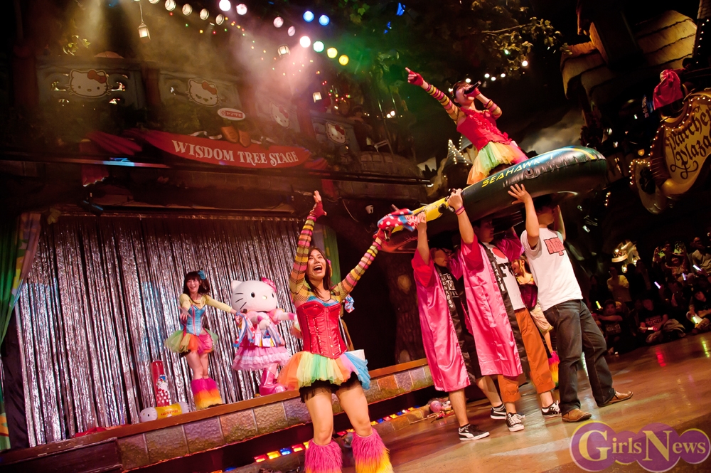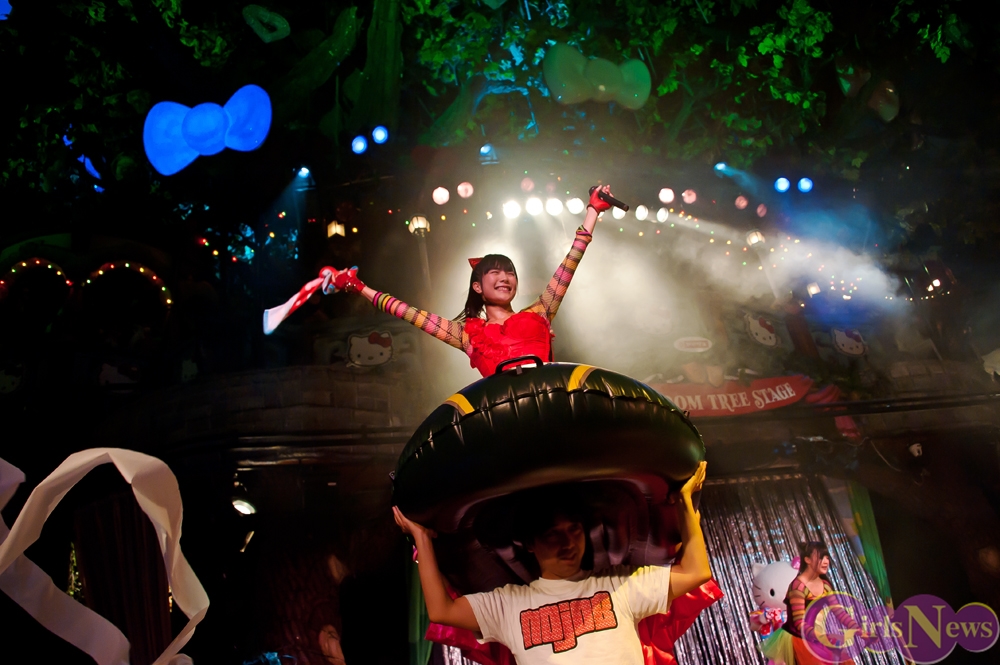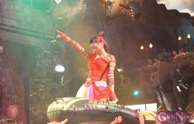 ライブは「大冒険☆」を披露した後、最後の楽曲「夏だね☆」でキティちゃんの愛称で大人気のハローキティが登場。仮面女子のセンターを努める立花あんなさんがゴムボートに乗ってサンリオピューロランドを航海しているところを、キティちゃんが可愛らしいケチャをする場面も!