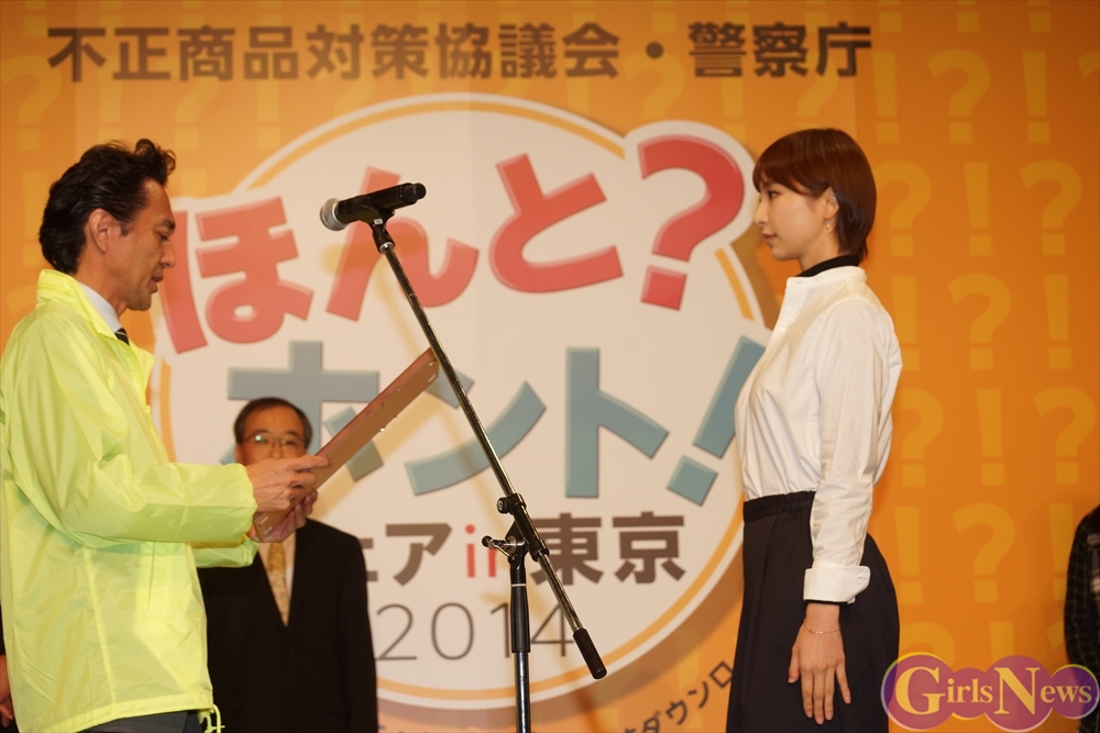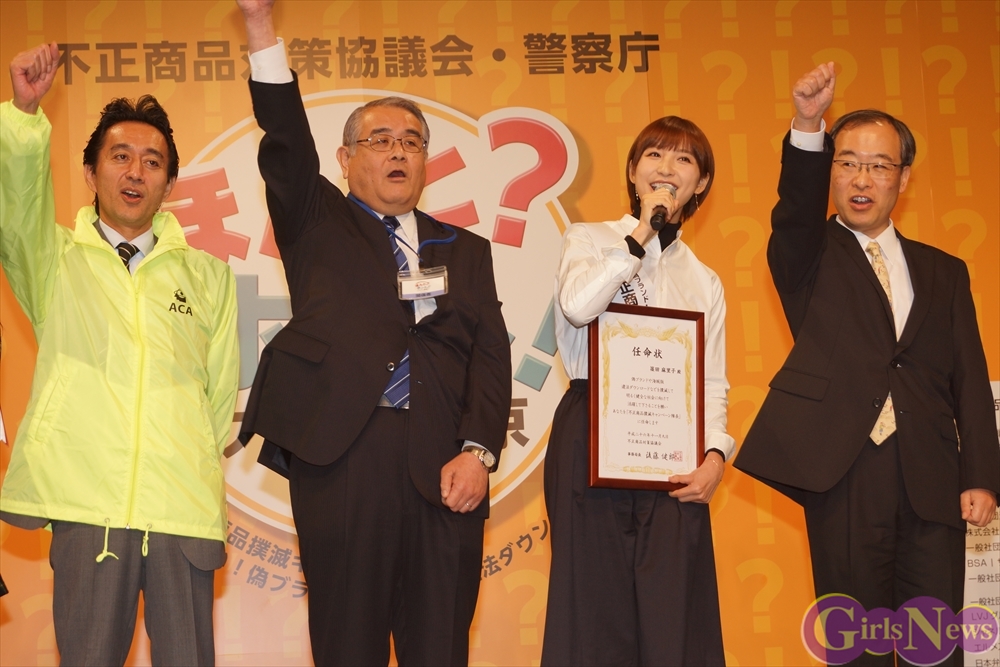 篠田麻里子さんは不正商品対策協議会 事務局長の後藤健郎さんと警察庁の上野正史さんからそれぞれ任命状とたすきの授与が行われた。