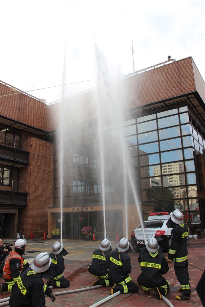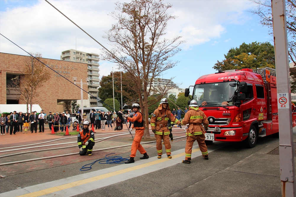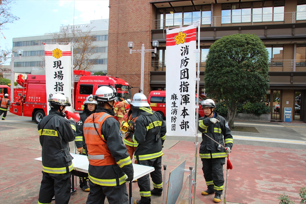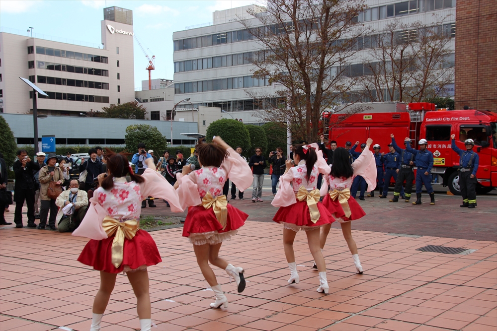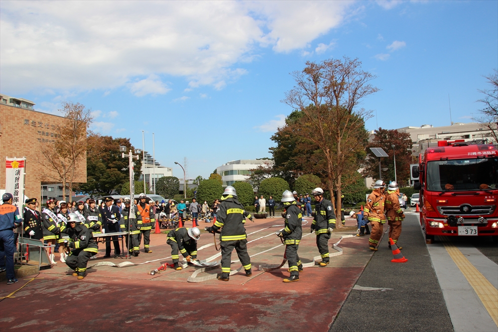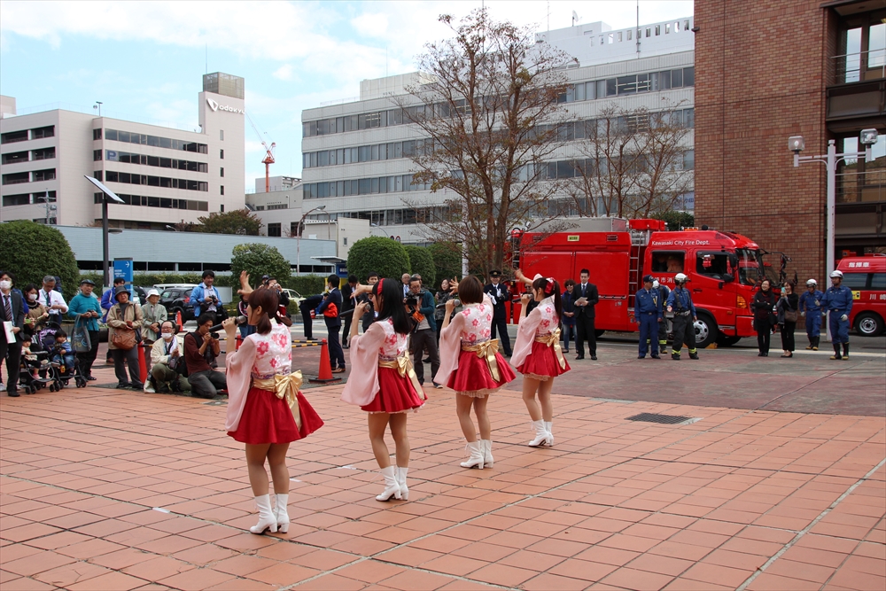 消防訓練では、麻生区役所で火災が発生した設定で、逃げ遅れた要救助者を救助する訓練を実施。川崎純情小町☆が指揮棒を振りかざし「各隊、かかれ!」の合図で救助活動が始まり、屋上から担架での救出や、ロープによる緊急脱出、最後には「放水始め!」の指揮で一斉放水が行われた。