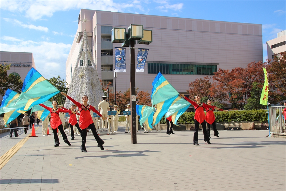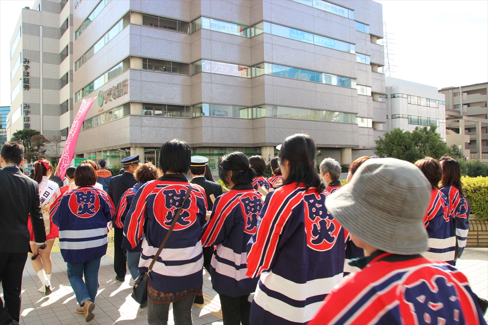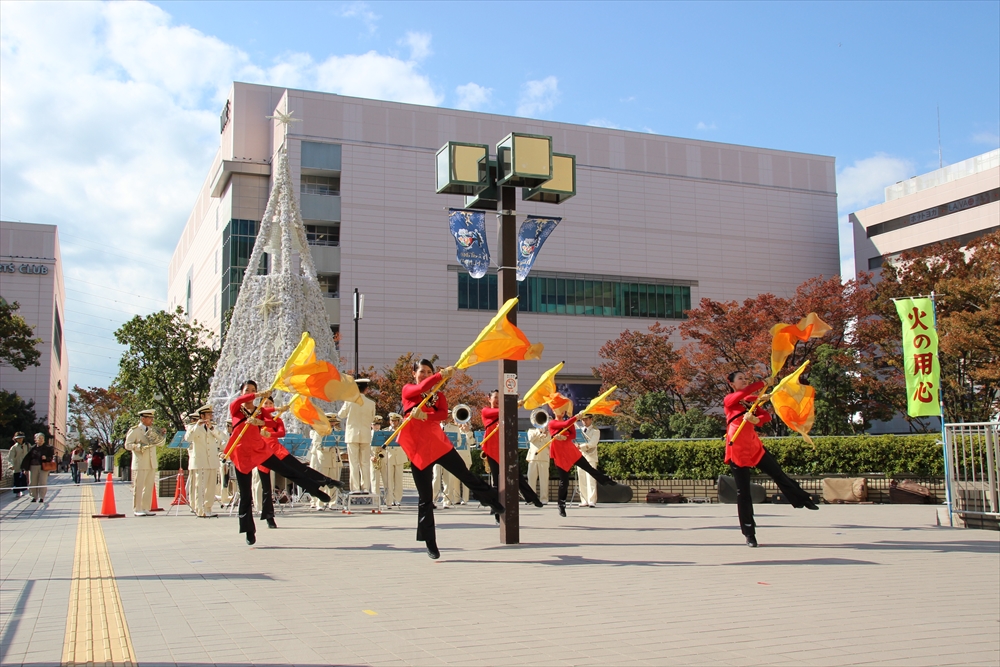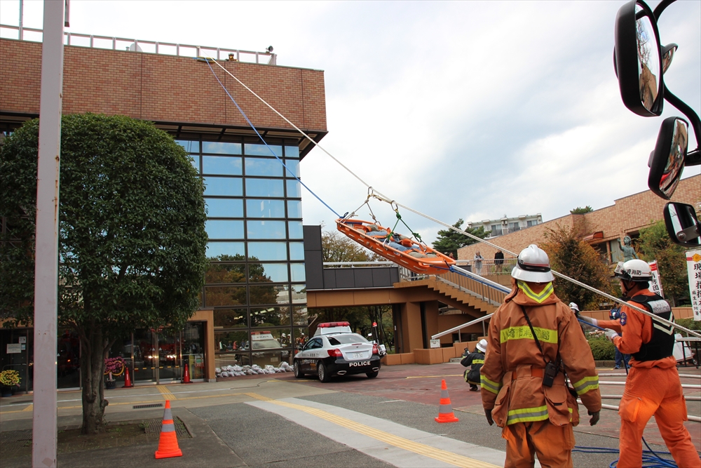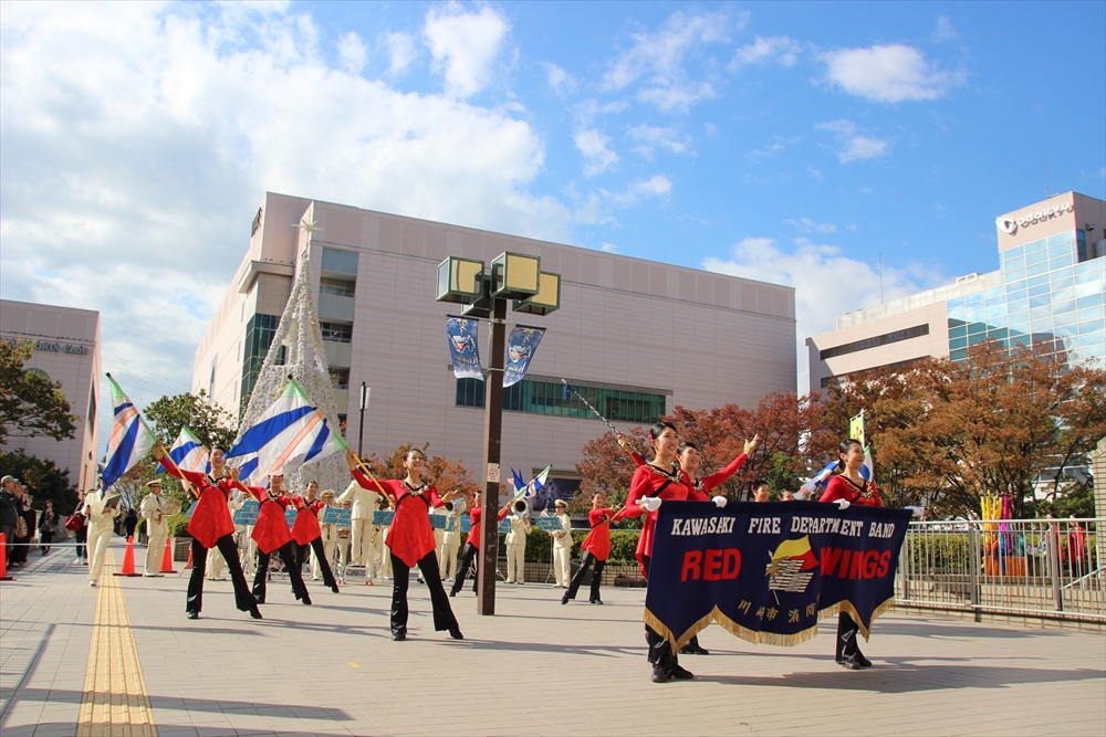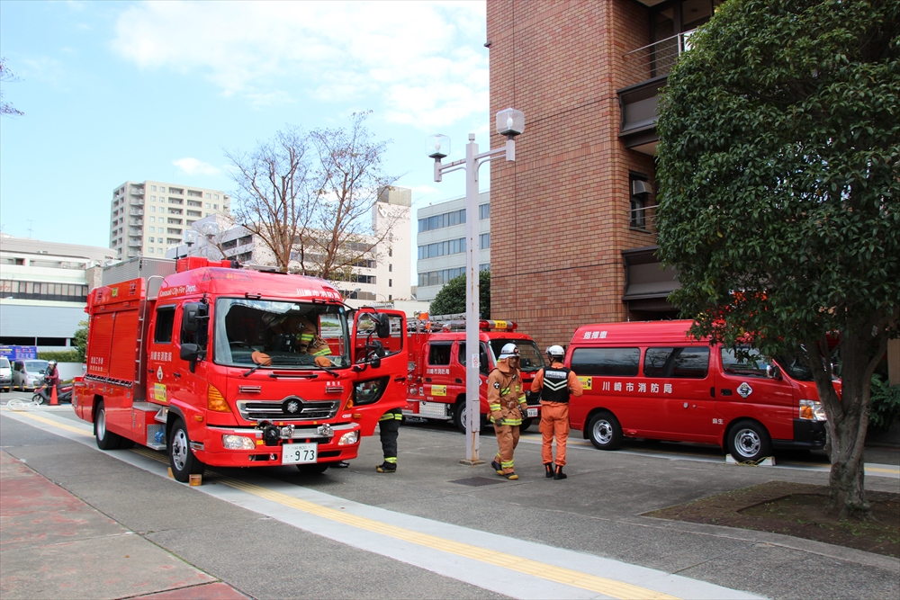 消防訓練では、麻生区役所で火災が発生した設定で、逃げ遅れた要救助者を救助する訓練を実施。川崎純情小町☆が指揮棒を振りかざし「各隊、かかれ!」の合図で救助活動が始まり、屋上から担架での救出や、ロープによる緊急脱出、最後には「放水始め!」の指揮で一斉放水が行われた。