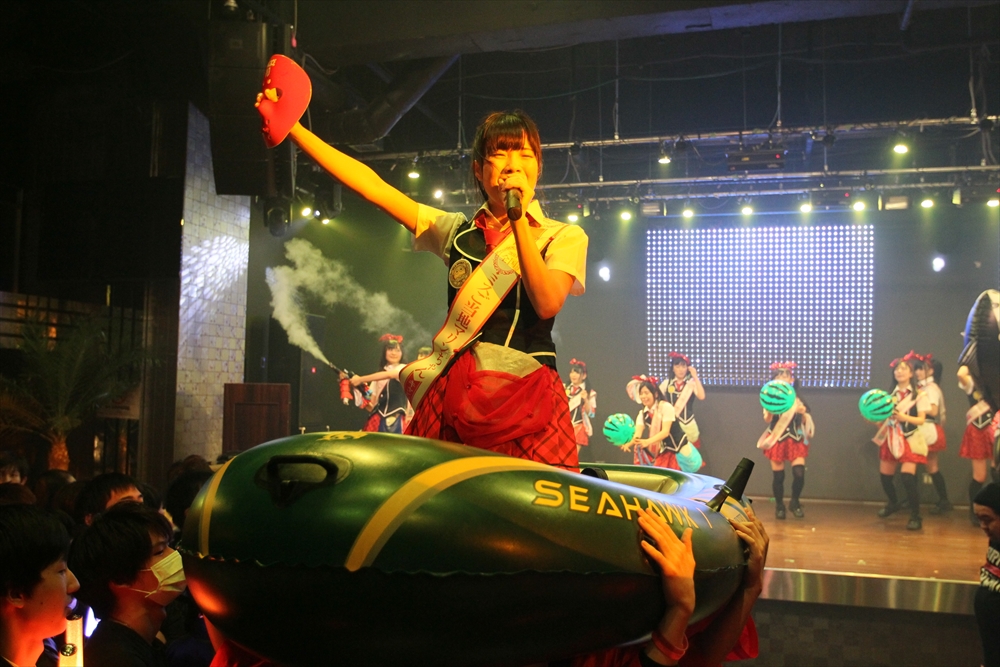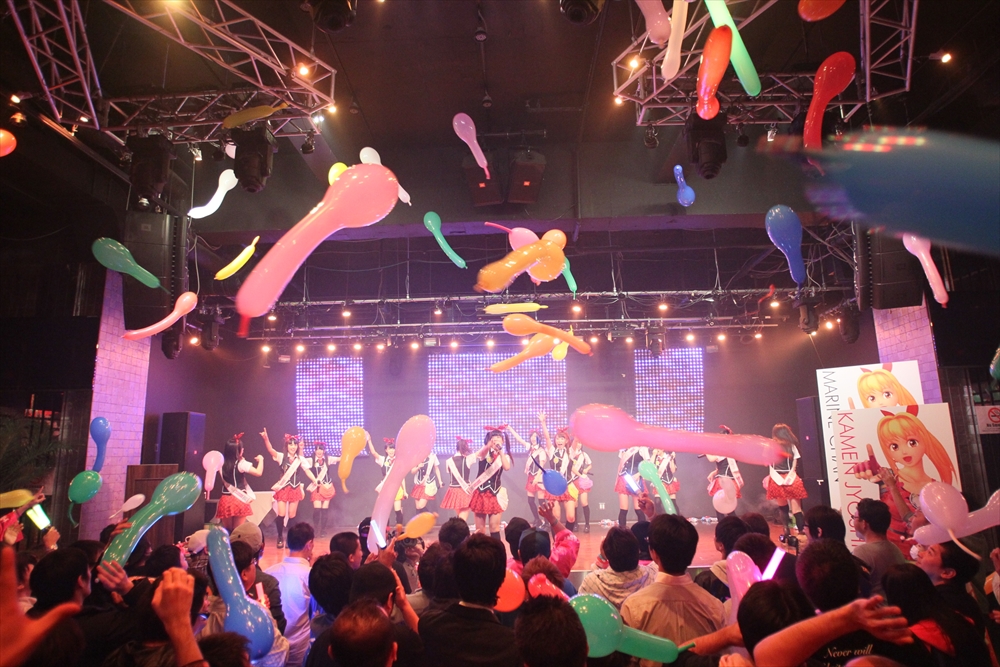 2組目は仮面女子。ミスマリンちゃんと同じ新衣装で登場し、「全開☆ヒーロー」「大冒険☆」「真・アドベンチャー」「夏だね☆」を熱唱し会場を盛り上げた。途中クロちゃんと髭原人も乱入し、彼女たちのトイレットペーパーガンでグルグル巻きにされるなど、前夜祭に相応しいお祭り騒ぎとなった。彼女たちの常設劇場、いわばホームでのステージとあって観客との息も文句無し。熱いステージで投票開始を勢いづけた。ラストはキャンペーンテーマソング「マリン☆ロード」。この楽曲は宮古島の青い空をイメージして作られたということで、まさにマリンちゃんにぴったり。ミス・モノクローム着ぐるみも登場し、全員で大盛り上がりの中、イベントは終了した。