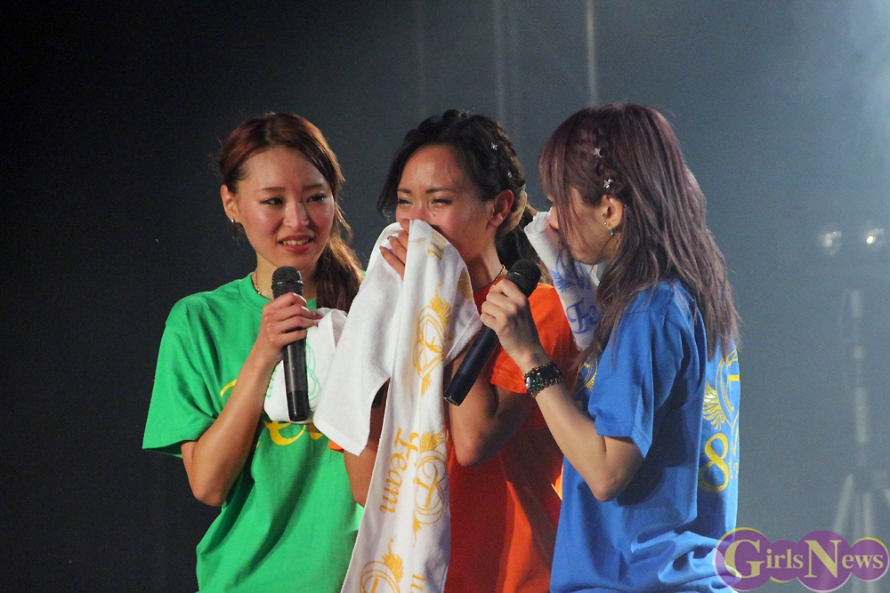 そして「たくさんのアイドルさんがいる中、もう同期もいなくなってきました。Feamは8年も続けてきて、これからもどんどん羽ばたいていきたい。ここまで来れたのは、事務所と忙しい時間を割いて来てくれるフィーマーさんのおかげ…。」と言葉を綴りながらも、Yukiさんが泣き出したのをきっかけに3人は次々と涙を浮かべた。