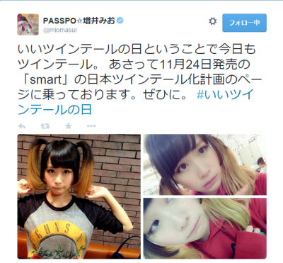 11月22日、PASSPO☆増井みおさんが「いいツインテールの日ということで今日もツインテール。」とTwitterを更新した。
