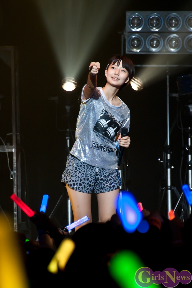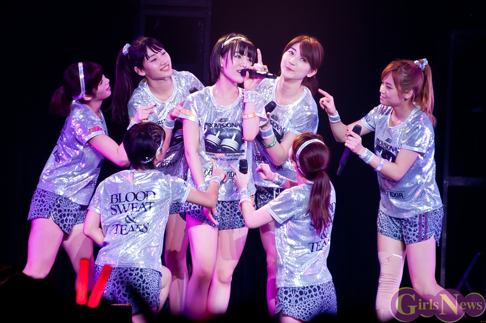 そして再び急かすようなカウントダウンから『イタダキを目指せ!』へ。そのまま実に10曲以上ものアッパーでダンサブルな曲をまさにノンストップメドレーで披露する7人。青、緑、赤と様々なレーザー光線が飛び交い、フロアはペンライトが輝く。『サバイバルガールズ』の“攻めて!攻めて!”で盛大なフラッシュが焚かれると半狂乱の新世界の扉が開かれたような盛り上がり。締めは『アッパーカット!』のピアノのリフレインへと繋がり、ラストへと到達した。