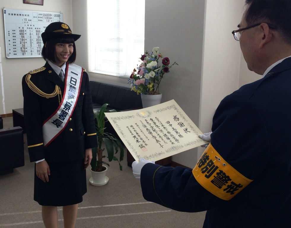 この日、1日警察署長となった田中美麗は、「平成26年度年末年始特別警戒出陣式」に参加。