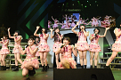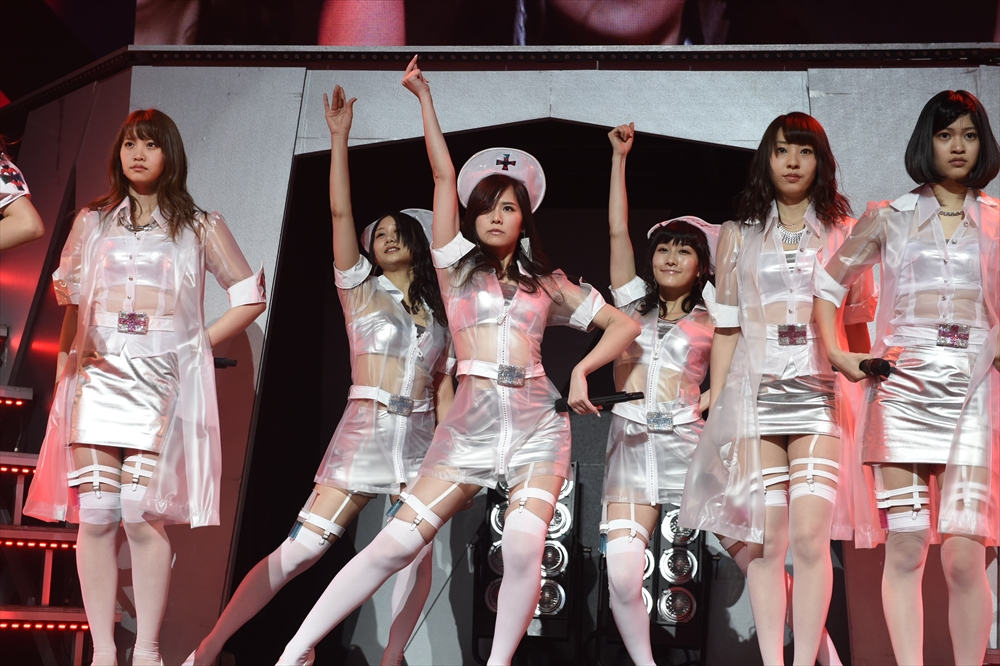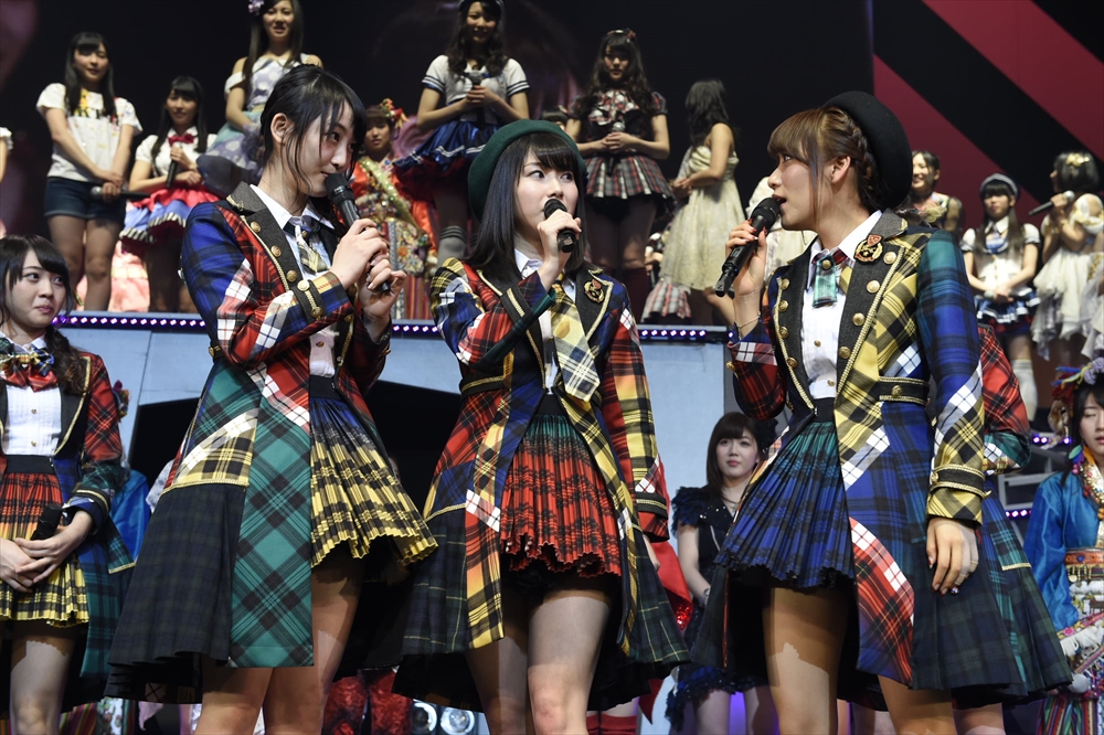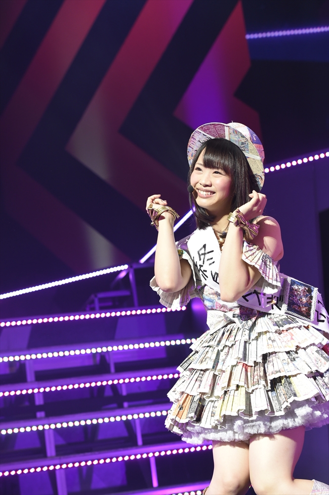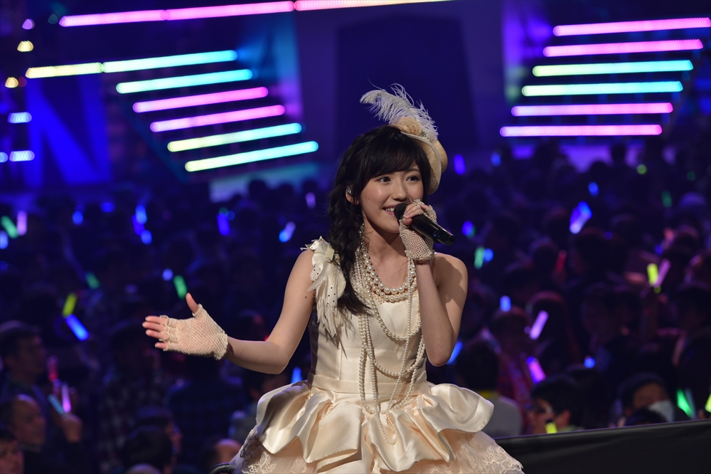 まず登場したのはセンターを小嶋菜月で『バラの果実』から。続き渡辺麻友、向井地美音が爽やかに『ファースト・ラビット』。雛壇に座る伊豆田莉奈は踊る大場美奈と手を振り合う。『今、HAPPY』はばら組。岡田奈々とAKB48チーム8から坂口渚沙をWセンターに大勢の若手メンバーと可愛らしくフレッシュに歌う。