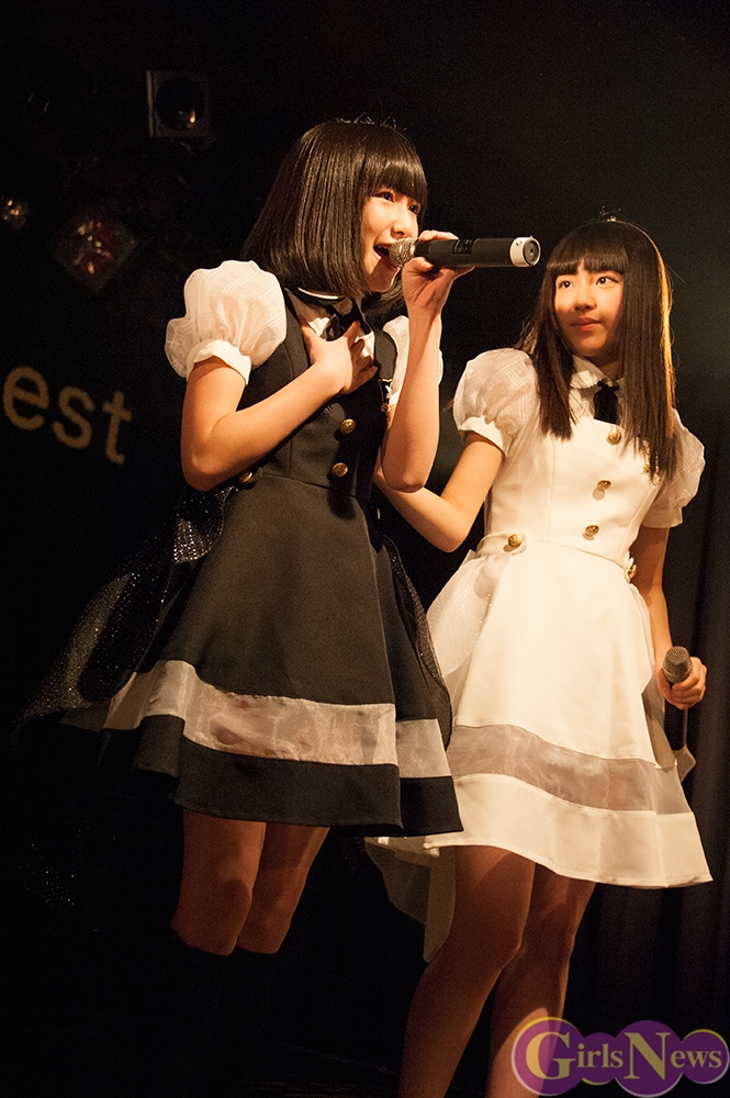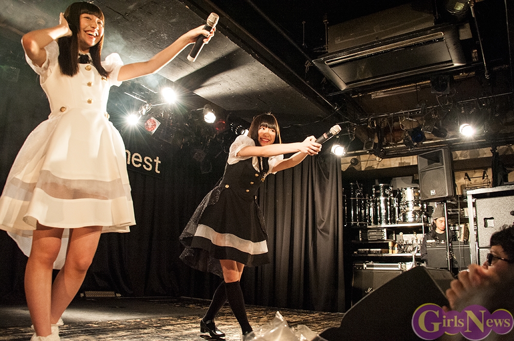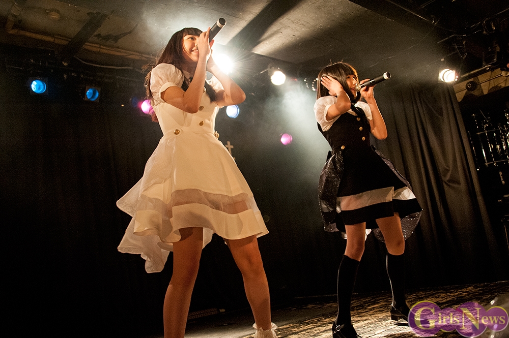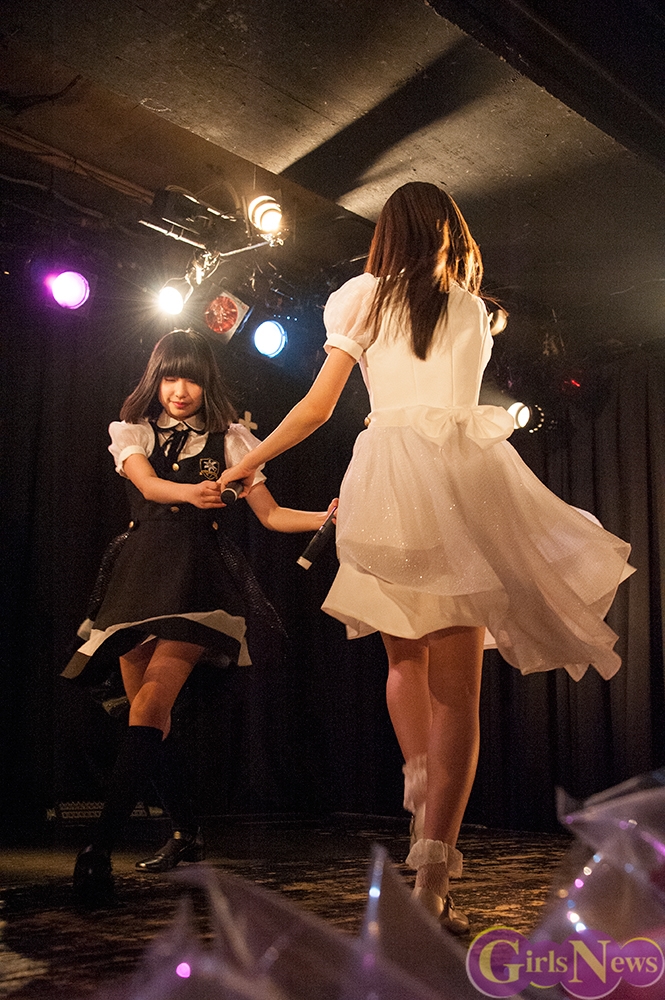 最初に登場したのは「りりりんね」の2人。黒と白の衣装をまとい、演劇調のオープニングから『卒業カウントダウン』を披露。スピード感のある曲に会場も大きくコールし、盛り上がる。エンディングも演劇的に静かにセリフが呟かれる。