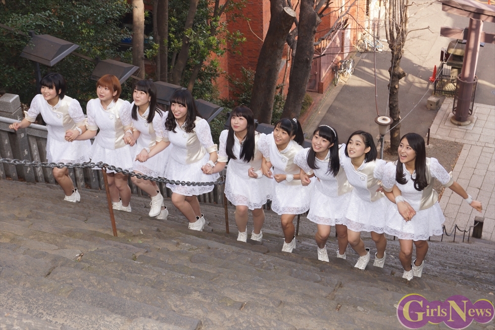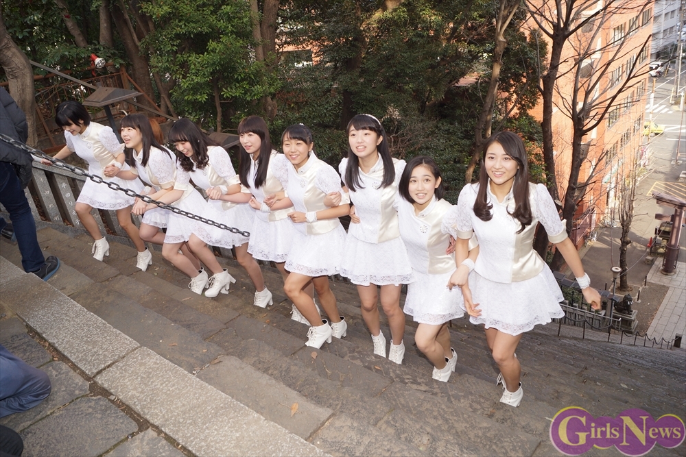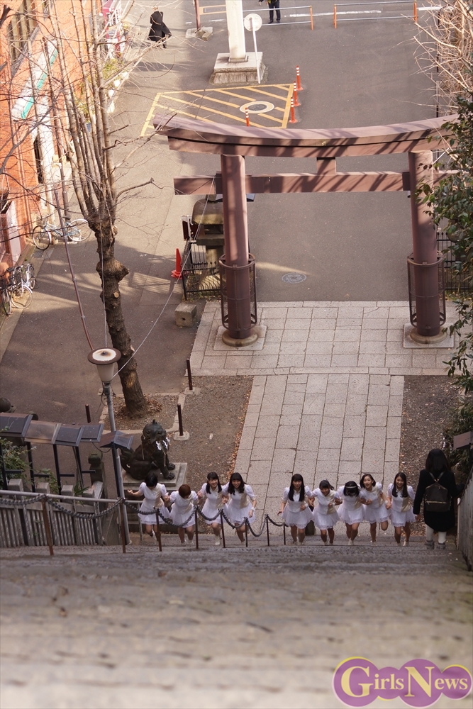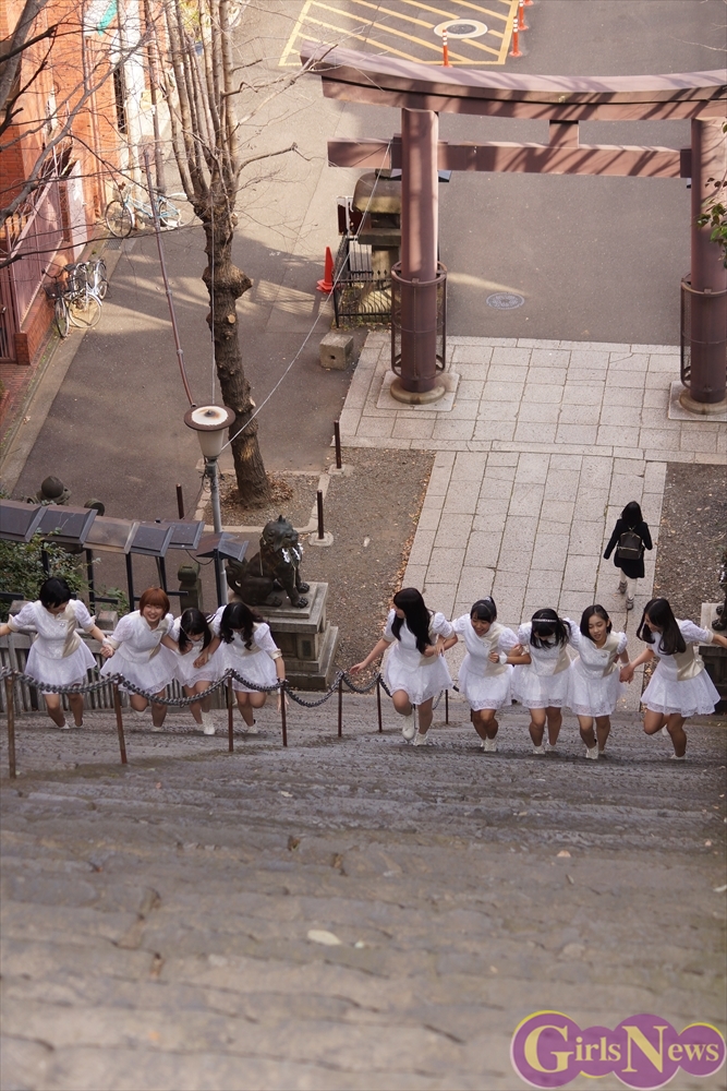 アンジュルムのメンバーは新メンバーを含め9人全員でその「出世の石段(男坂)」を仲良く手を繋いで横一線に並び、半袖にスカートのステージ衣装にも関わらず、寒さを吹き飛ばす勢いで元気に登り切った。
