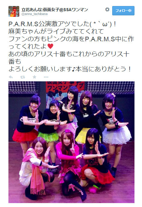 2月9日、仮面女子:アリス十番のセンター、立花あんなさんが「P.A.R.M.S公演激アツでした( *`ω´)!」とTwitterで報告した。