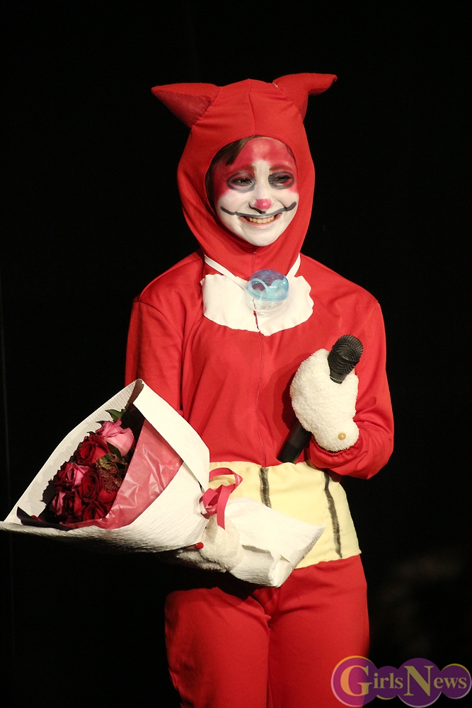 そして、ひょうきんな格好と不釣り合いなほど、真顔になったまみちょんが「今日はみなさんにイニミニちゃんからお知らせがあります。」と切り出したその時、「ちょっと待ったー!」の掛け声とともにお祝いのケーキと花束が手渡され、「イニミニちゃーん、3周年おめでとう!」という声が会場のファンから響いた。
