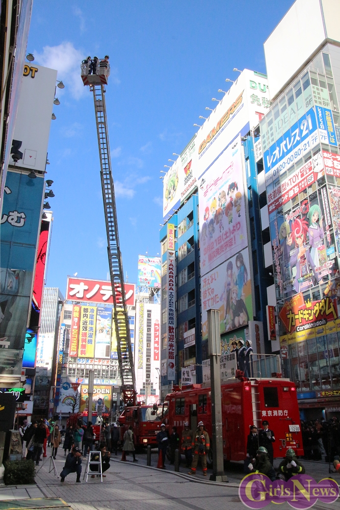 秋葉原にあるディアステージから生まれたユニットでんぱ組.incを迎えて行なわれた消防演習は、昨年夏に新装オープンした秋葉原ラジオ会館で、消防隊やビルの関係者を含めて約100名が参加して実施された。