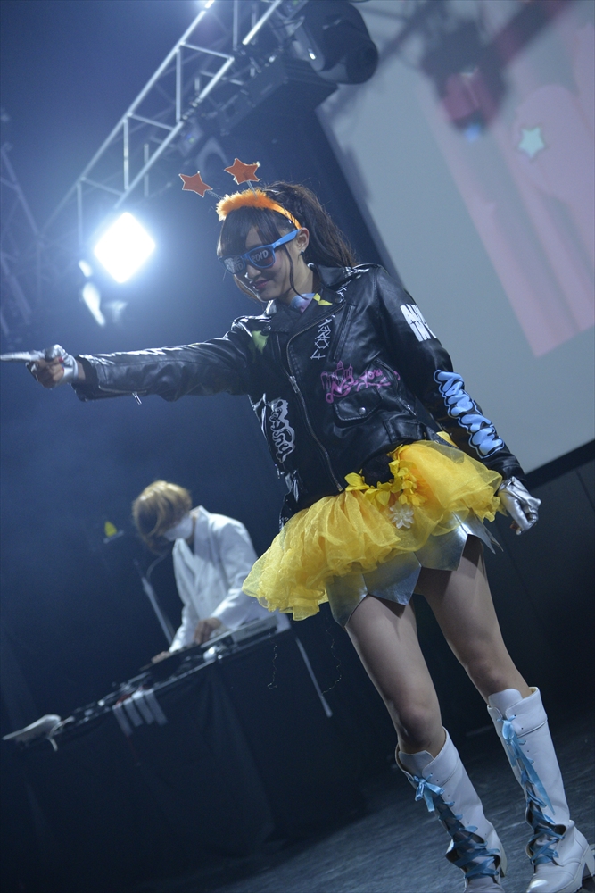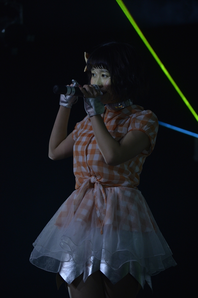 今回の見所の一つは“近未来”、“アンドロイド”をテーマにした会場演出。立体的なレーザー光線が四方に飛び交い、バックスクリーンは曲のリズムに合わせて予想外な動きをする刺激的なVJ演出の数々。さらにドクターを驚かせたのは、事前に募集していた写真素材。スクリーンに投影されるだけに留まらず、写真素材が人型になり、テレパシー、モアモアタイムをメンバーと一緒に踊りだしたのだ。最新鋭のVFX技術を駆使し、藤堂ラナのダンスをVFXキャプチャーし、その動きに合わせ写真素材が動くようプログラミングされていたのだ。ラブアンドロイドのコンセプトである“近未来感”を見事に演出していた。