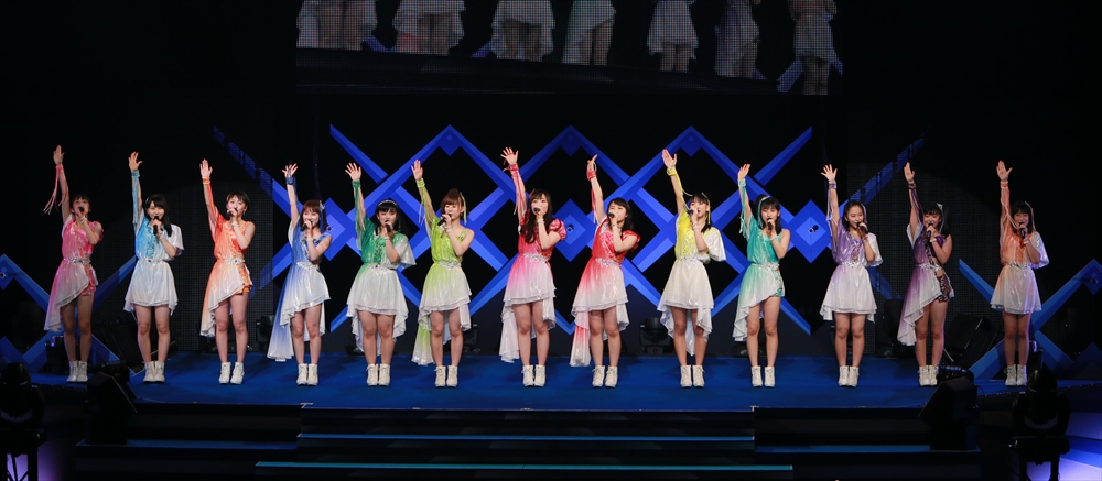 オープニング映像後、色とりどり13色のイメージカラー衣装にチェンジしたメンバーが再び登場し、4月発売のトリプルA面ニューシングルから「夕暮れは雨上がり」も初披露。出会いと別れの多いこの時期の春の門出にはぴったりの応援ソングだ。