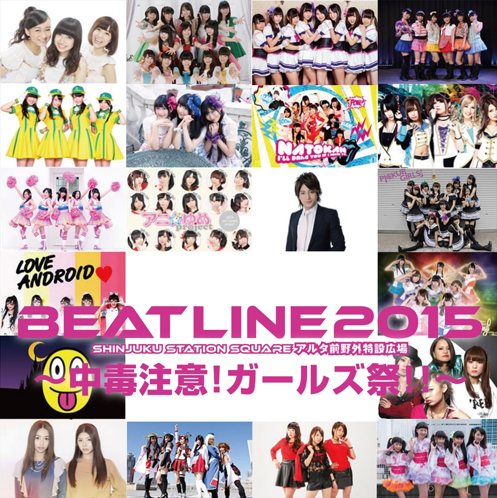 これまではスタジオアルタという空間を舞台に、アイドルを中心とした「収録用ライブイベント」を行ってきたBEAT LINE TV.だが、今回はスタジオを飛び出し、スタジオアルタの対面に ある公園「新宿ステーションスクエア」に特設ステージを設置。3月21日(土)の12時から、なんと”総勢20組、150名”に及ぶアイドルやガールズバンドを集めた無料イベント「BEAT LINE SPRING 2015′ 新宿駅東口野外 ミュージックフェス~中毒注意!!ガールズ祭!!~」を開催する。