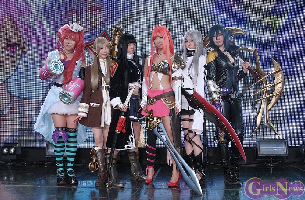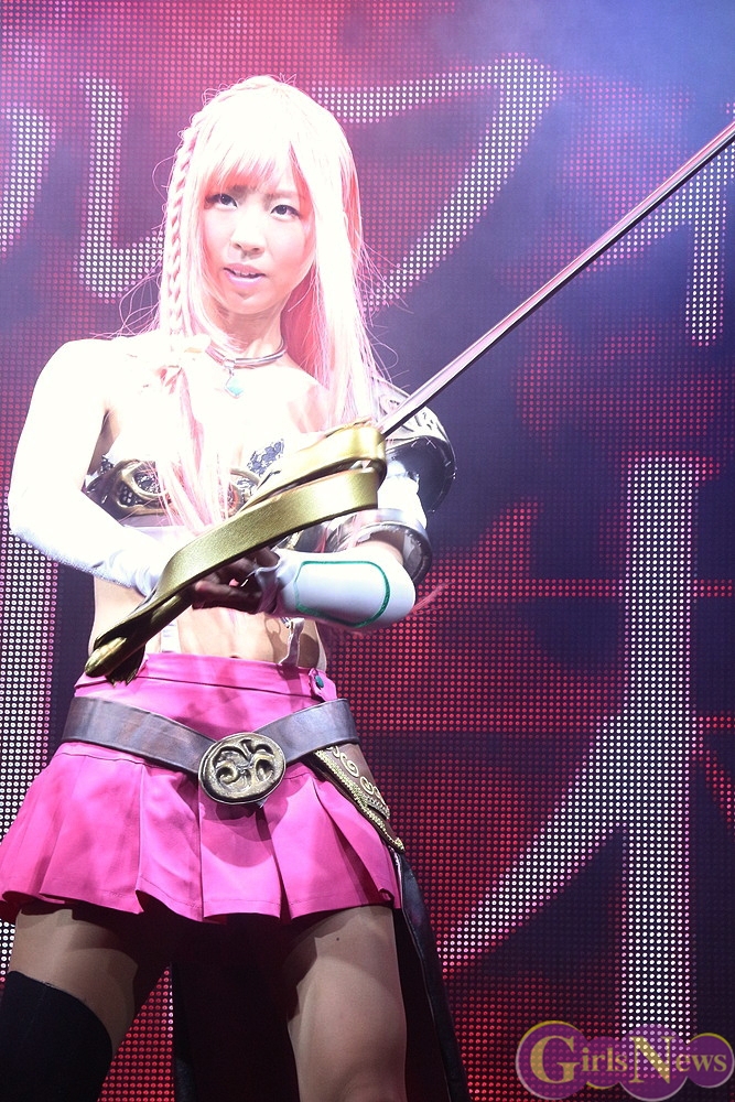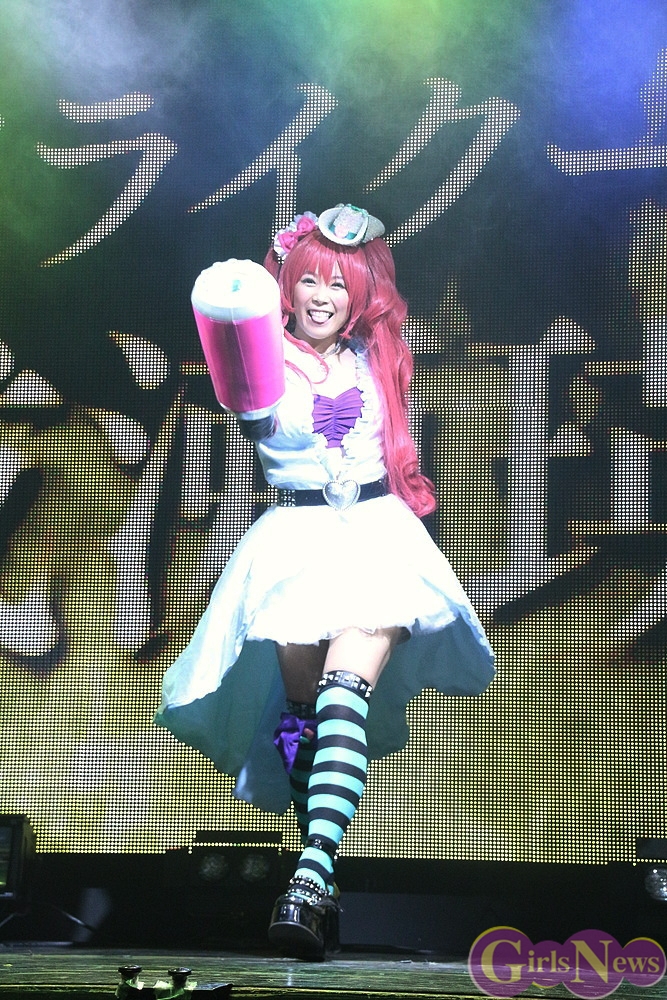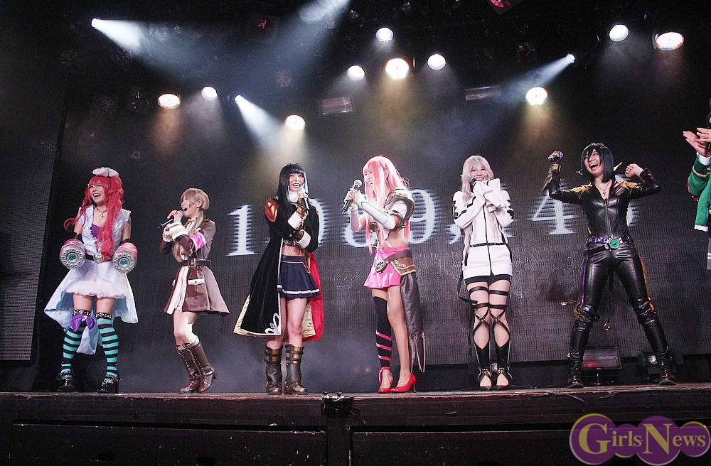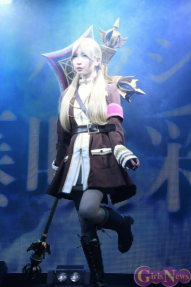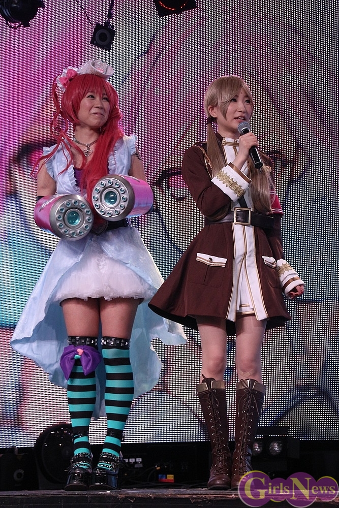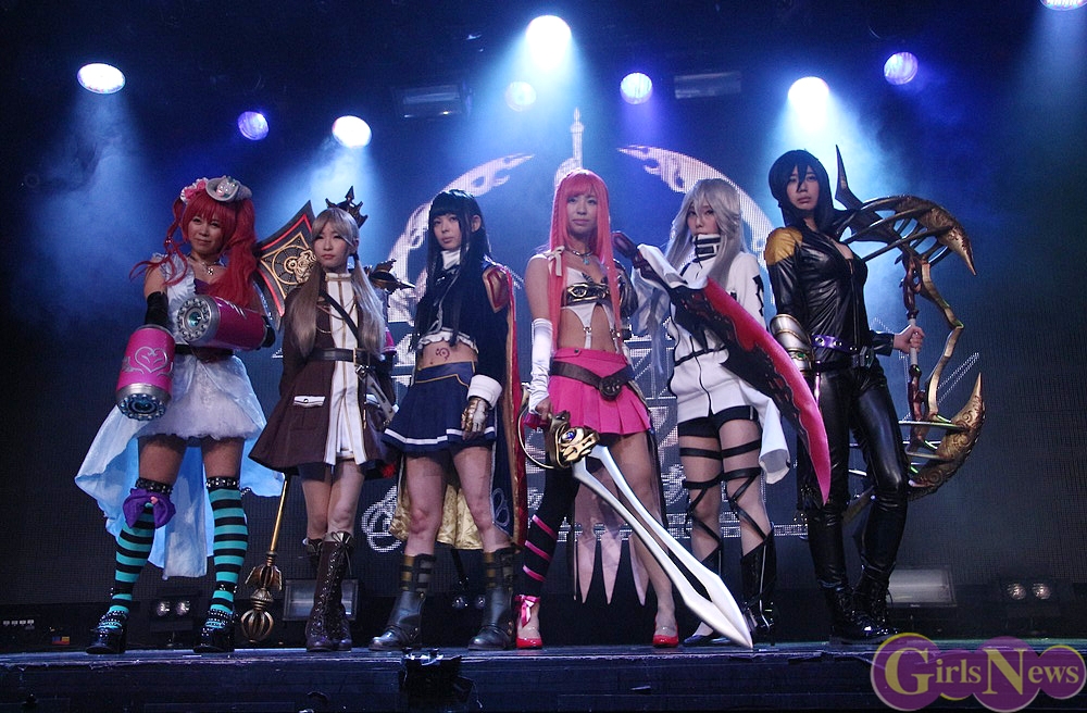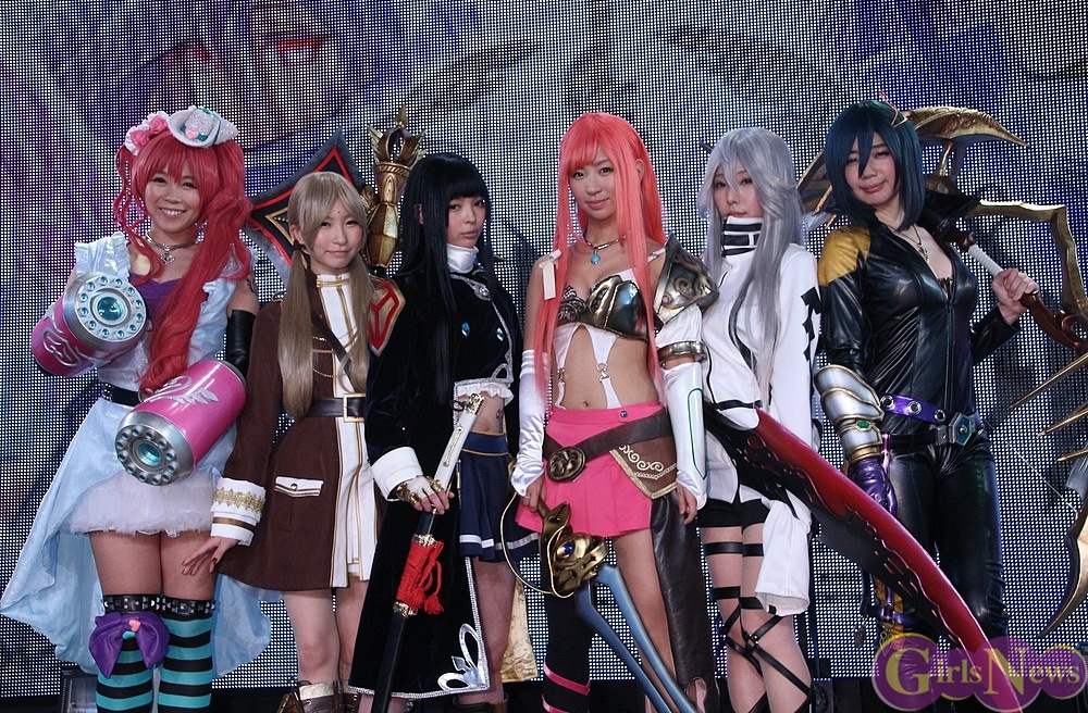 ゲームに登場するキャラクターそのままの完成度の高いコスプレでステージに登場したでんぱ組.inc(成瀬瑛美、藤咲彩音、最上もが、古川未鈴、相沢梨紗、夢眠ねむ)は、大きな武器を手にさっそうとポージングを披露した。