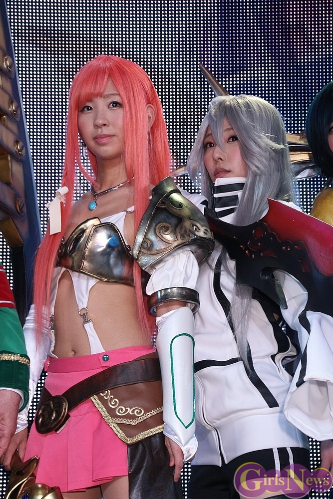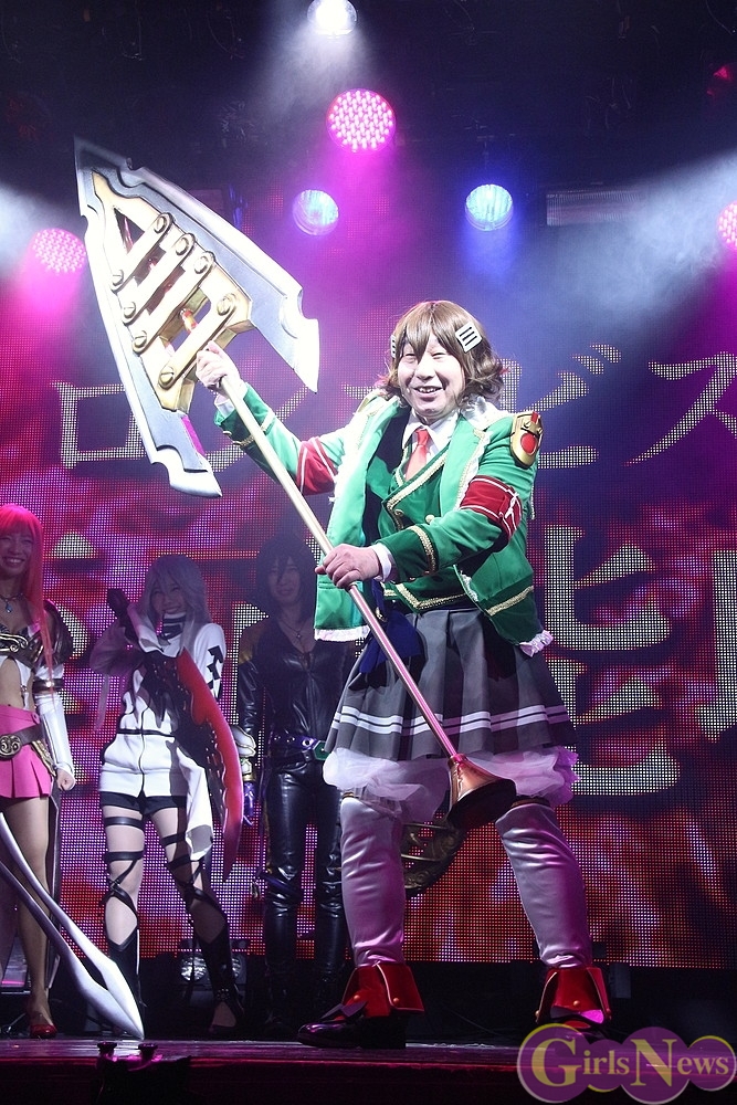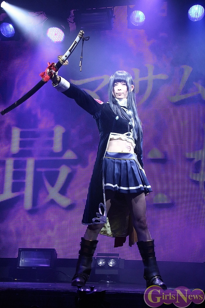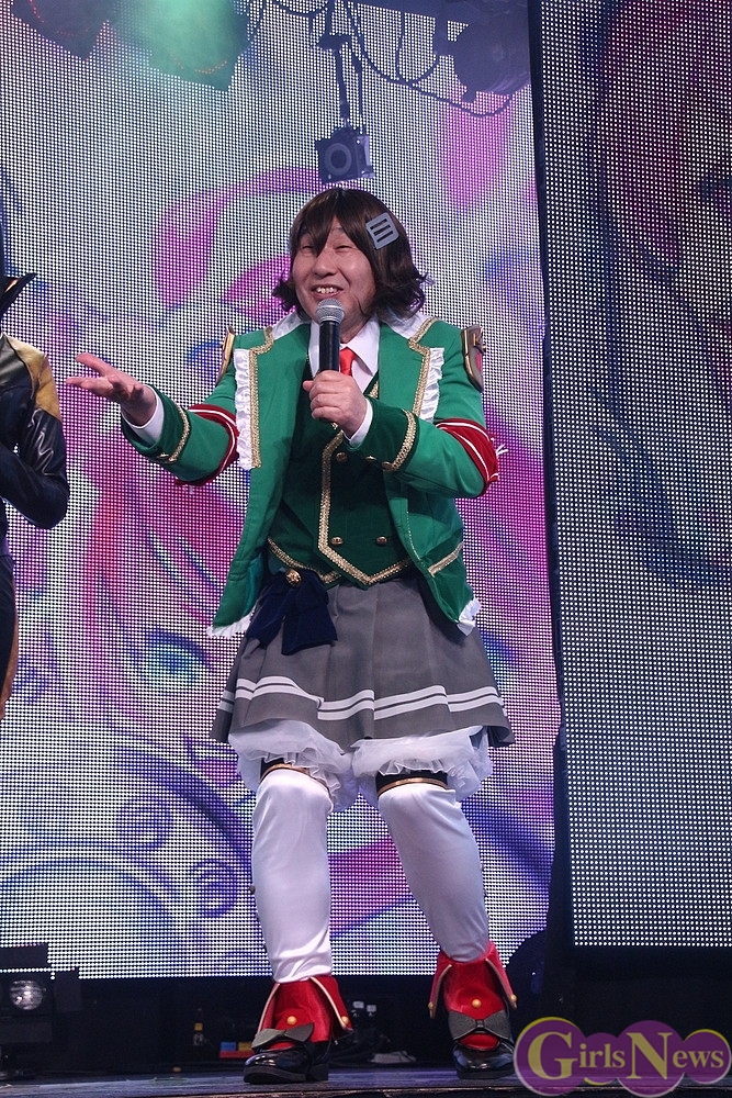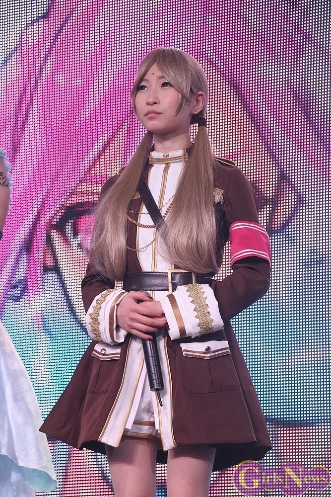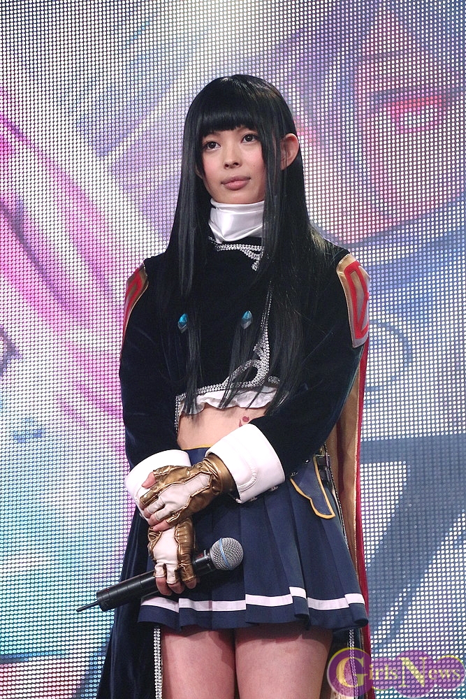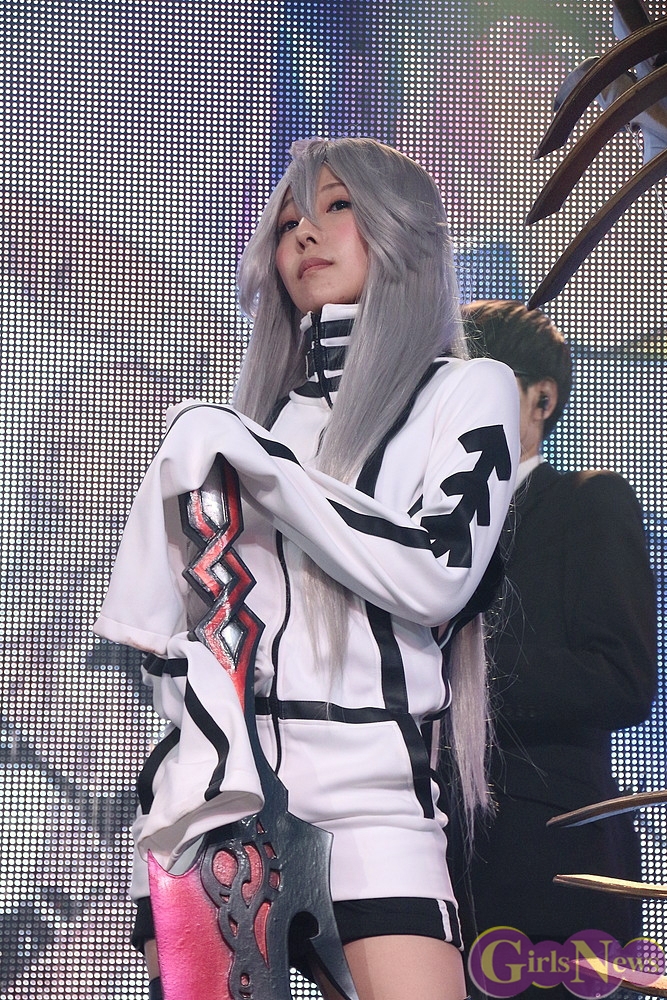 ゲームに登場するキャラクターそのままの完成度の高いコスプレでステージに登場したでんぱ組.inc(成瀬瑛美、藤咲彩音、最上もが、古川未鈴、相沢梨紗、夢眠ねむ)は、大きな武器を手にさっそうとポージングを披露した。