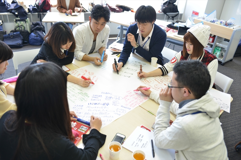 ワークショップでは、アップアップガールズ(仮)の7人のメンバーはそれぞれ1人ずつに分かれ、ワールドカフェ方式という席替えをしながら語る相手を変えていく形式で、「最も印象に残っている選挙体験」、「選挙のいいところわるいところ」、「若者が選挙に行かない理由って?」といったテーマについて、その場に集まった東大生や若者選挙ネットワーク等の参加者たちとの対話に参加し、意見交換を行った。